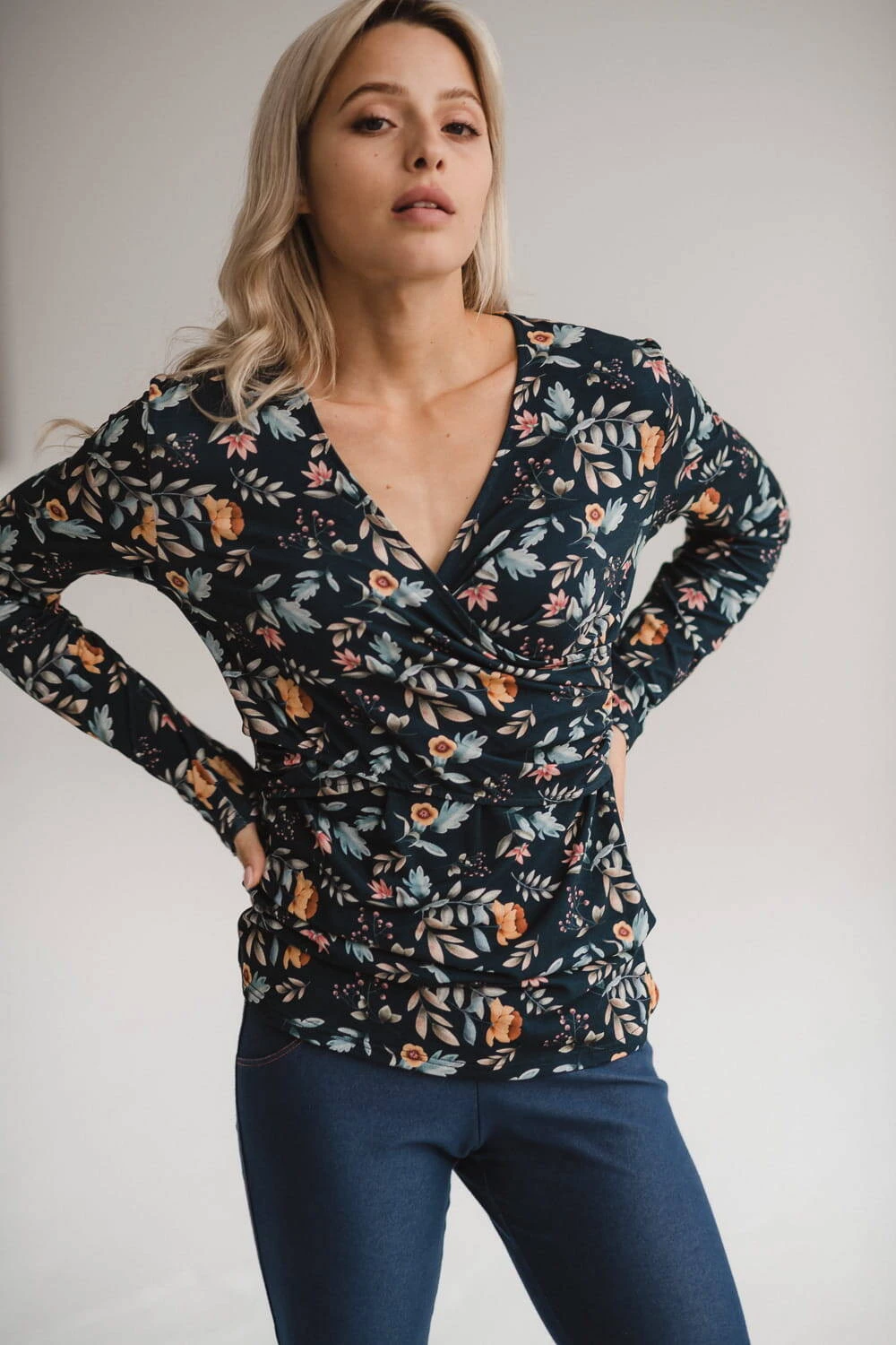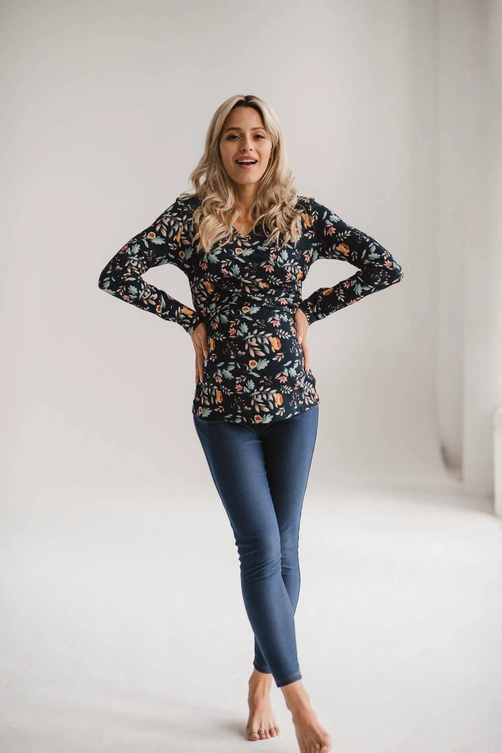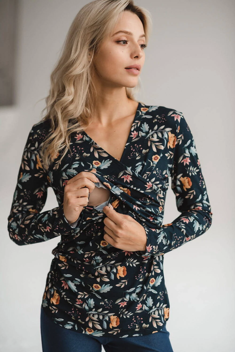 Halenka s dlouhým rukávem s květinovým vzorem pro budoucí maminky je jedinečným kouskem oblečení, který v sobě snoubí funkčnost, pohodlí a módní styl. Květinové motivy na tmavě modrém podkladu dodávají halence svěžest a stylovou eleganci. Tato praktická těhotenská halenka byla pečlivě navržena pro nastávající maminky a kojící maminky a poskytuje jim pohodlí v každé fázi těhotenství i po něm. Elastický materiál a vypasovaný střih dokonale zdůrazní rostoucí těhotenské bříško a zároveň zajistí volnost pohybu. Vyberte si dokonalé řešení: stylovou těhotenskou halenku, která s vámi zůstane dlouho! Pohodlné dámské těhotenské halenky pro kojící maminky jsou bestsellerem, který by neměl chybět ve vašem těhotenském šatníku!