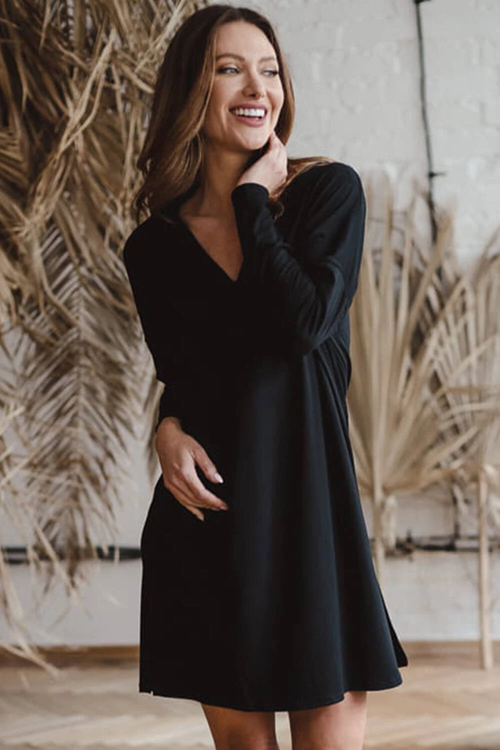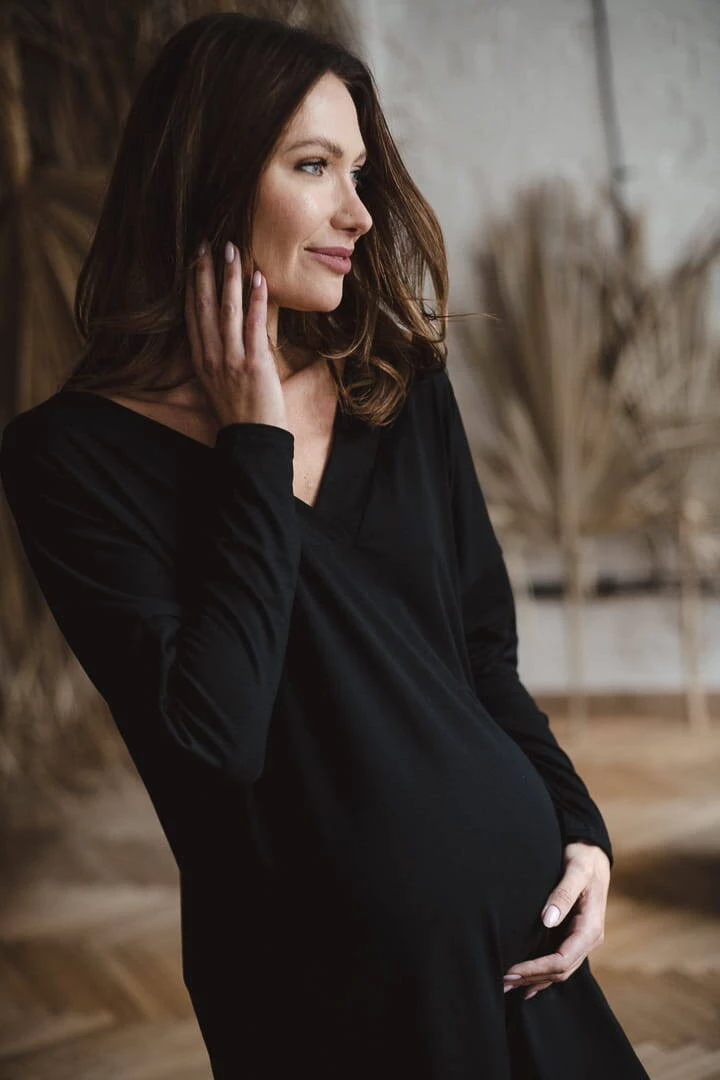 Bambusová těhotná a kojící noční košile s dlouhým rukávem Moon, černá