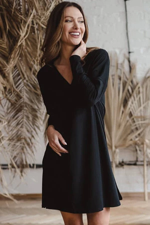 Délka noční košile je pečlivě upravena a zajišťuje pohodlí a volnost pohybu jak při nočních procházkách po nemocničních chodbách, tak při krmení novorozence. Vyztužený výstřih do V je praktickým řešením, které usnadňuje krmení miminka – miminko můžete nakrmit rychle a diskrétně při zachování naprostého soukromí. Oversize střih černé košile splní očekávání každé budoucí maminky. Dámská těhotenská košile je nejen pohodlné noční prádlo, které poskytuje prostor pro rostoucí bříško, ale také skvělé řešení, které zaručí pěkný vzhled po porodu bez ohledu na změny vaší postavy. Dokonalá noční košile Moon je vyrobena z nejkvalitnější bambusové viskózy a prošla přísnými testy, aby zajistila maximální pohodlí a bezpečí pro vás i vaše dítě.