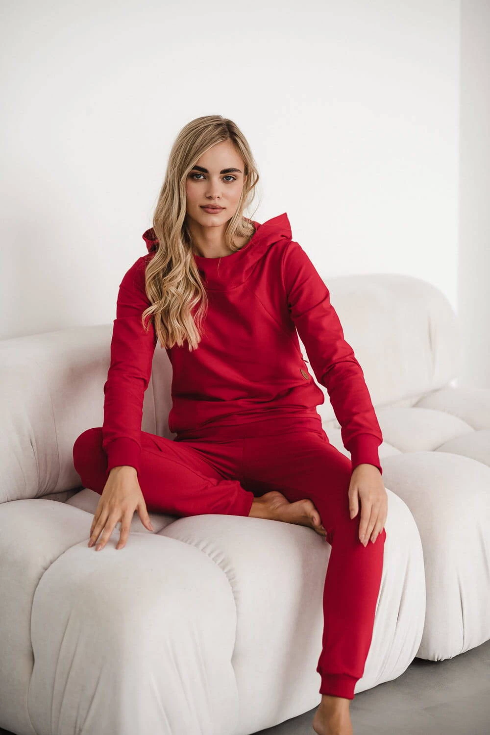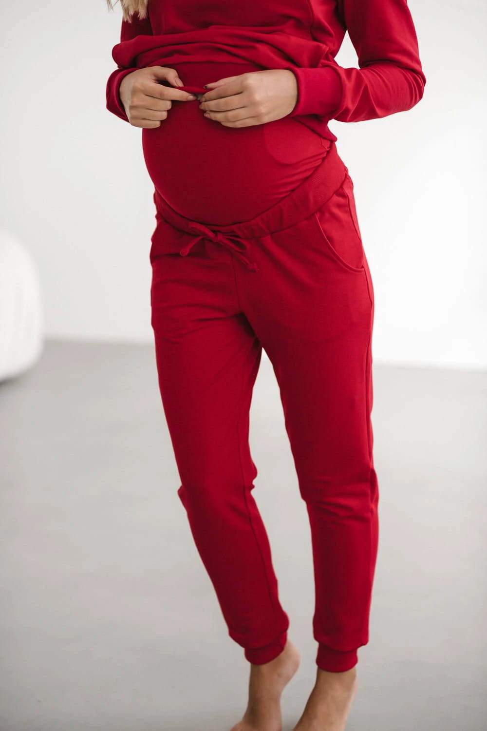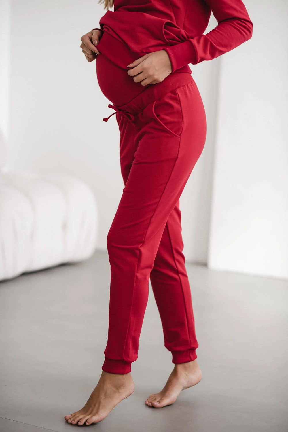 Tepláky v krásném červeném odstínu jsou návrhem pro ženy, které mají rády pěkná a praktická řešení. Střih kalhot, který vás může provázet i po porodu, protože pas s měkkou gumou a stahováním na šňůrku u těchto pohodlných kalhot netlačí na břiše, když se zotavujete z těhotenství.