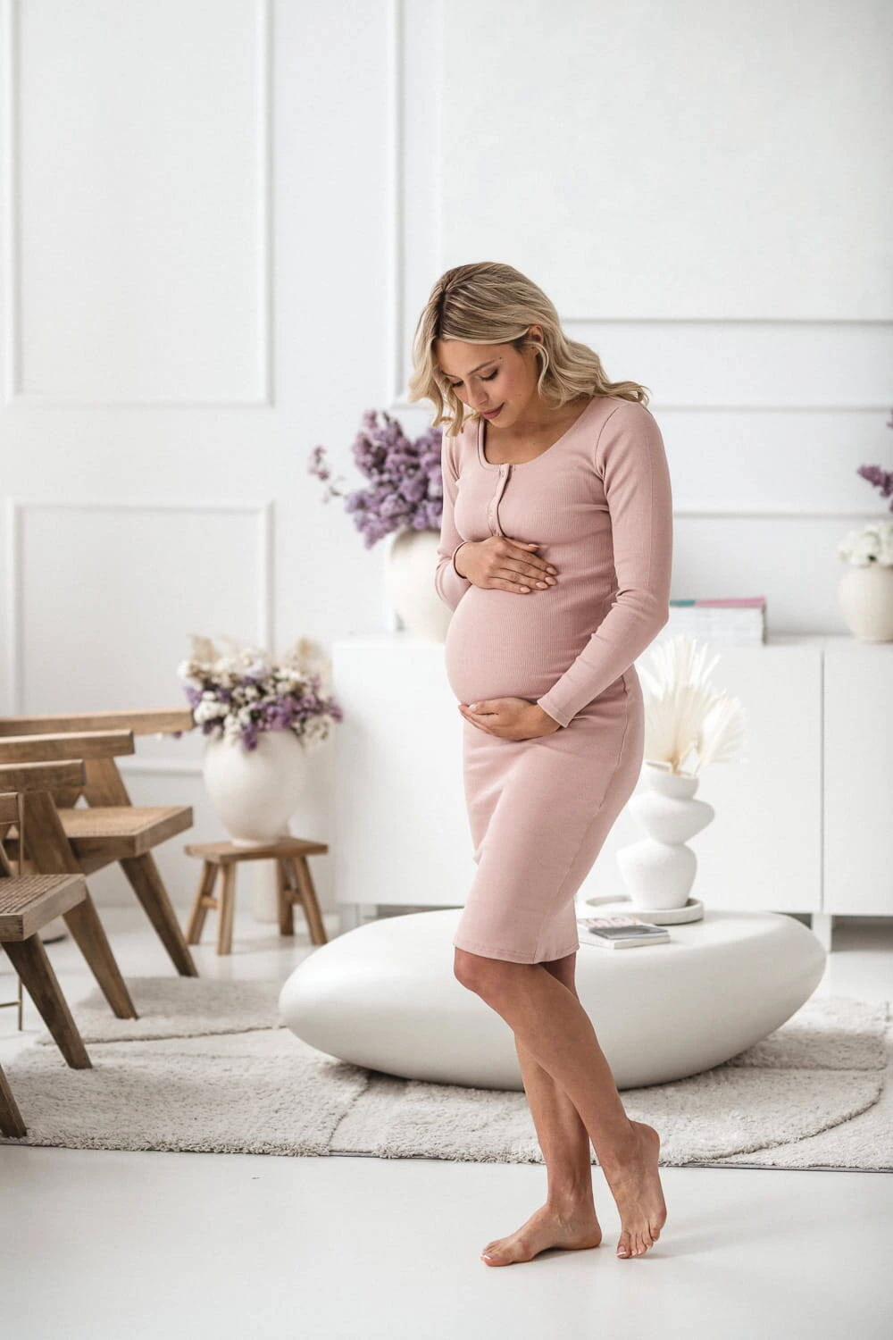 Žebrované těhotenské a kojící šaty na bříško - Pudrově růžová