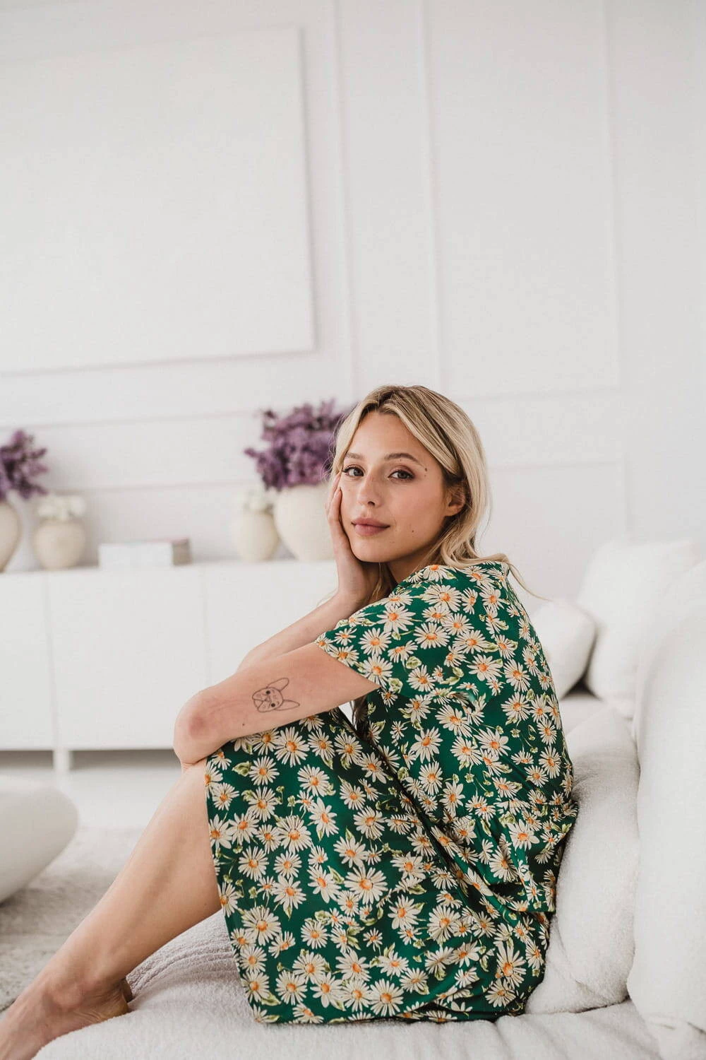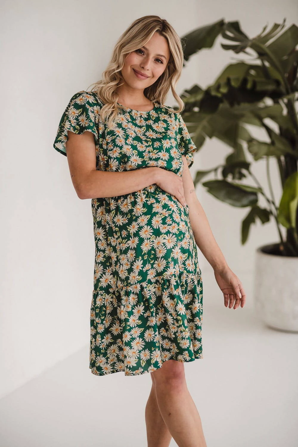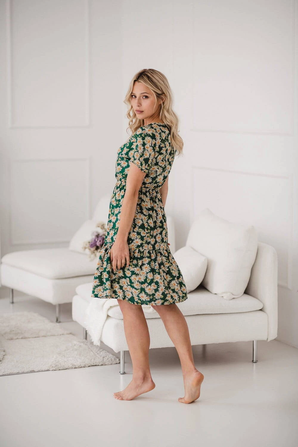 Jemné těhotenské a kojící šaty pro teplé letní dny! Tento model zelených kojících šatů je určen k nošení i v těhotenství, má krátké rukávy a je zakončen půvabným volánem. Šaty pro kojící maminky s gumičkou pod poprsím tento styl krásně padnou jak na bříško v těhotenství, tak po porodu. Šaty pro maminky a novopečené maminky byly vyrobeny v Polsku z kvalitní viskózové látky s originálním vzorem heřmánků na zeleném podkladu.