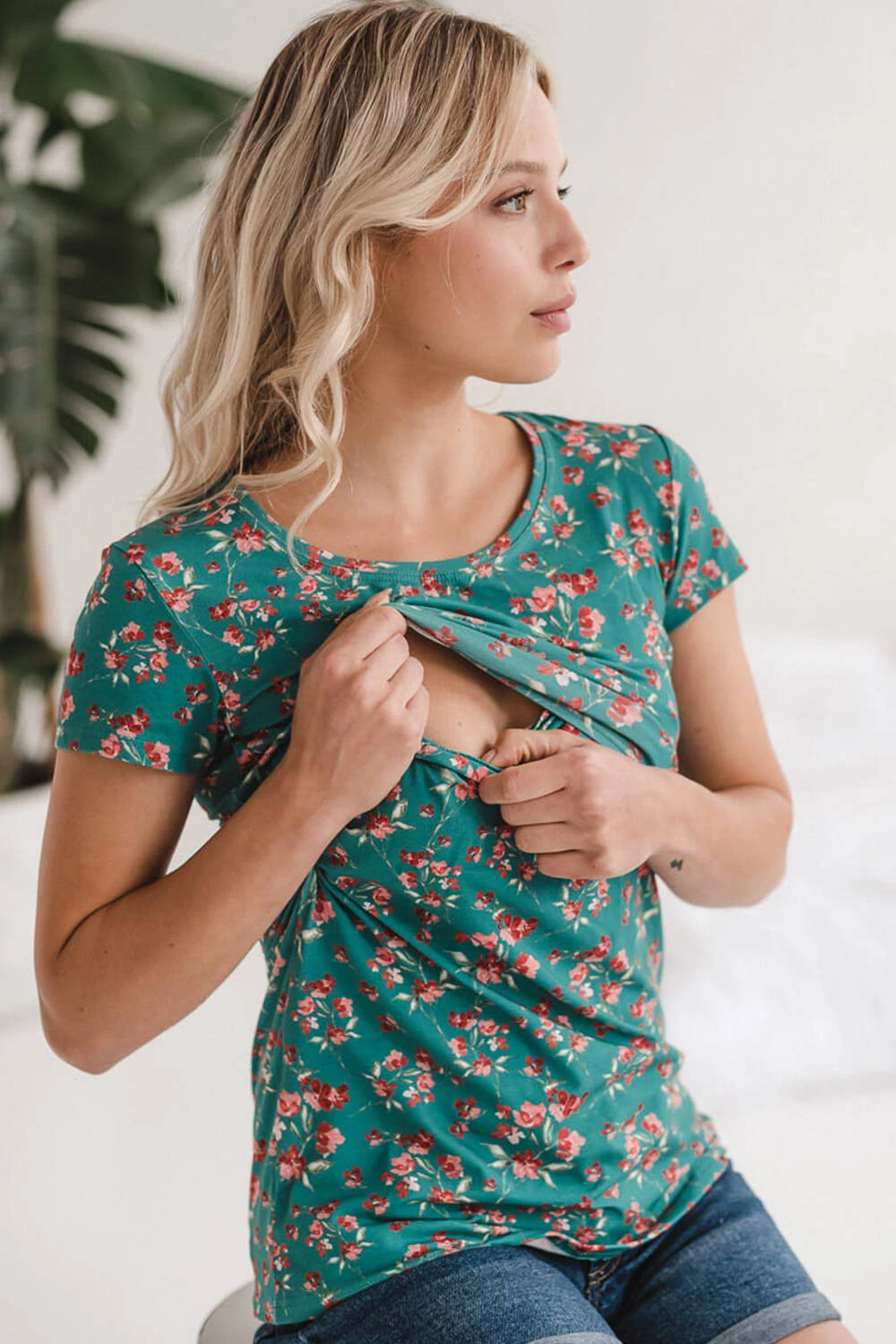 Těhotenská a kojící halenka Milk Shirt, krátký rukáv, zelená s květinami