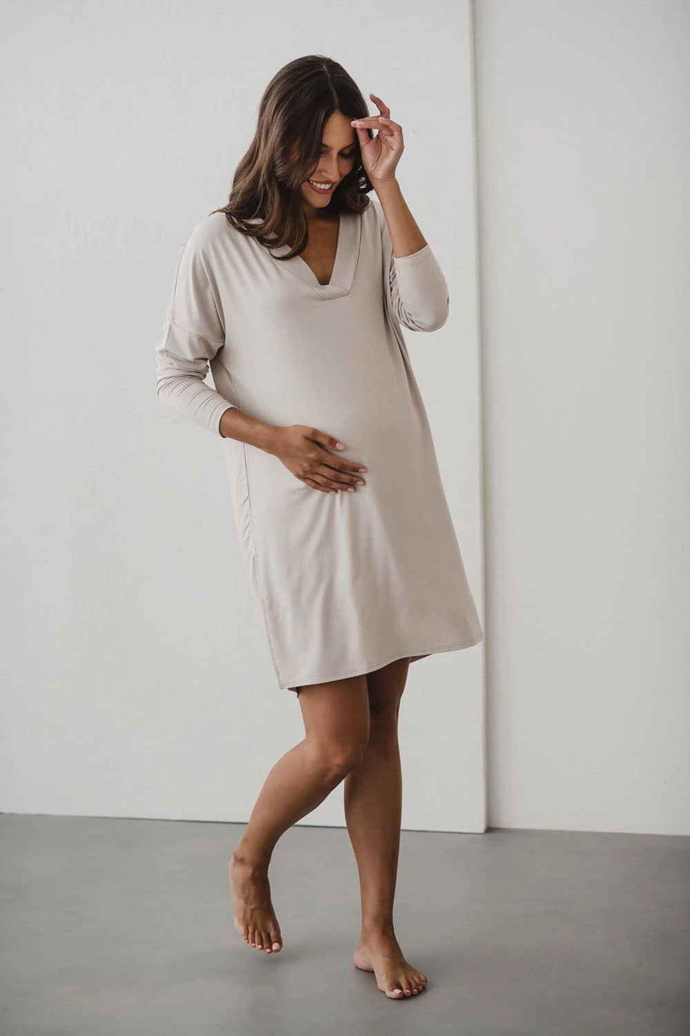 Oversize střih béžové košile uspokojí každou budoucí maminku, těhotenská košile je pohodlná noční košile, která poskytne nejen prostor pro rostoucí těhotenské bříško, ale zaručí, že po porodu budete vypadat skvěle bez ohledu na měnící se postavu. Těhotenské triko Moon vyrobené z nejkvalitnější bambusové viskózy prošlo všemi testy, aby vám poskytlo maximální pohodlí a bezpečí.