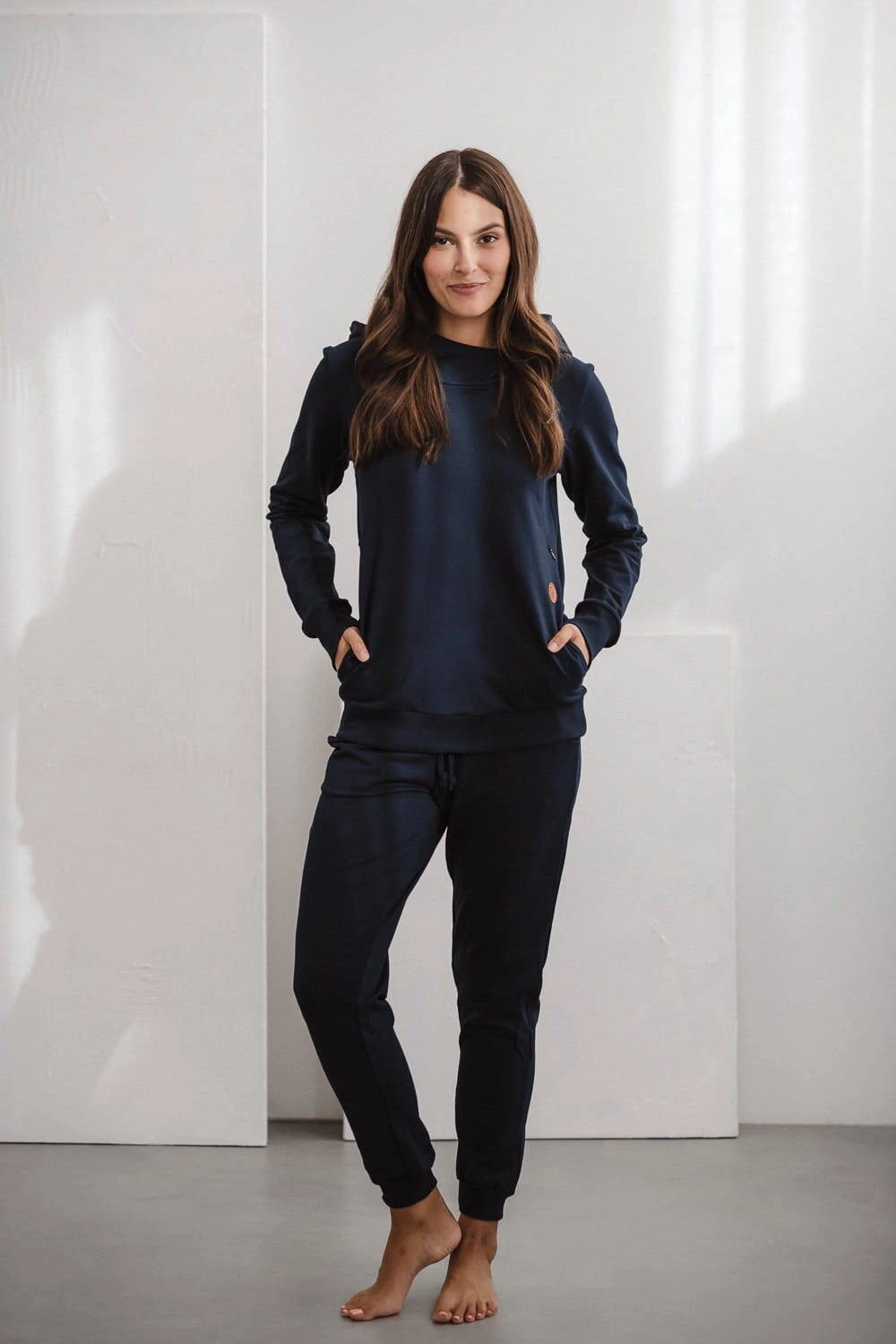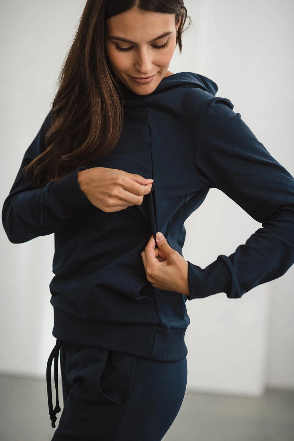 Tmavě tmavě modrá těhotenská a kojící mikina byla pro vás vytvořena s ohledem na pohodlí, funkčnost a skvělý vzhled bez ohledu na trimestr těhotenství. Naše kojicí mikina Milk Please je víc než jen těhotenské oblečení - je to pocit měkkosti a svobody, který vás provází každý den a podporuje pohodlné kojení. Těhotenská mikina na kojení má skryté zipy, zajišťující diskrétní kojení i na veřejných místech. Toto jedinečné těhotenské oblečení můžete nosit od začátku v těhotenství, při kojení i později. Námořnická modrá mikina na kojení a těhotenství je tak pohodlná, že si ji oblíbíte na dlouhou dobu, zvláště když se vám vrátí postava z předtěhotenství.