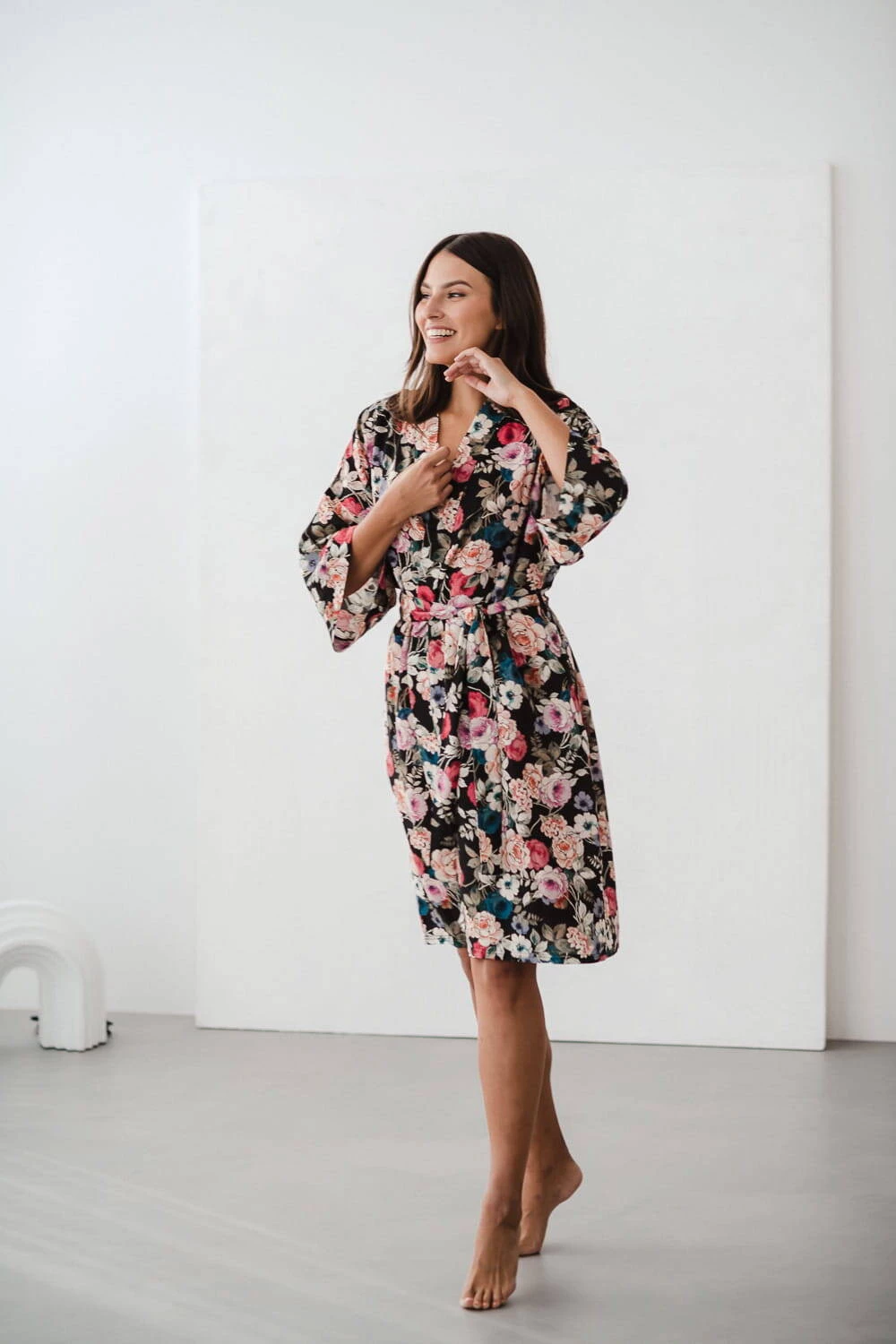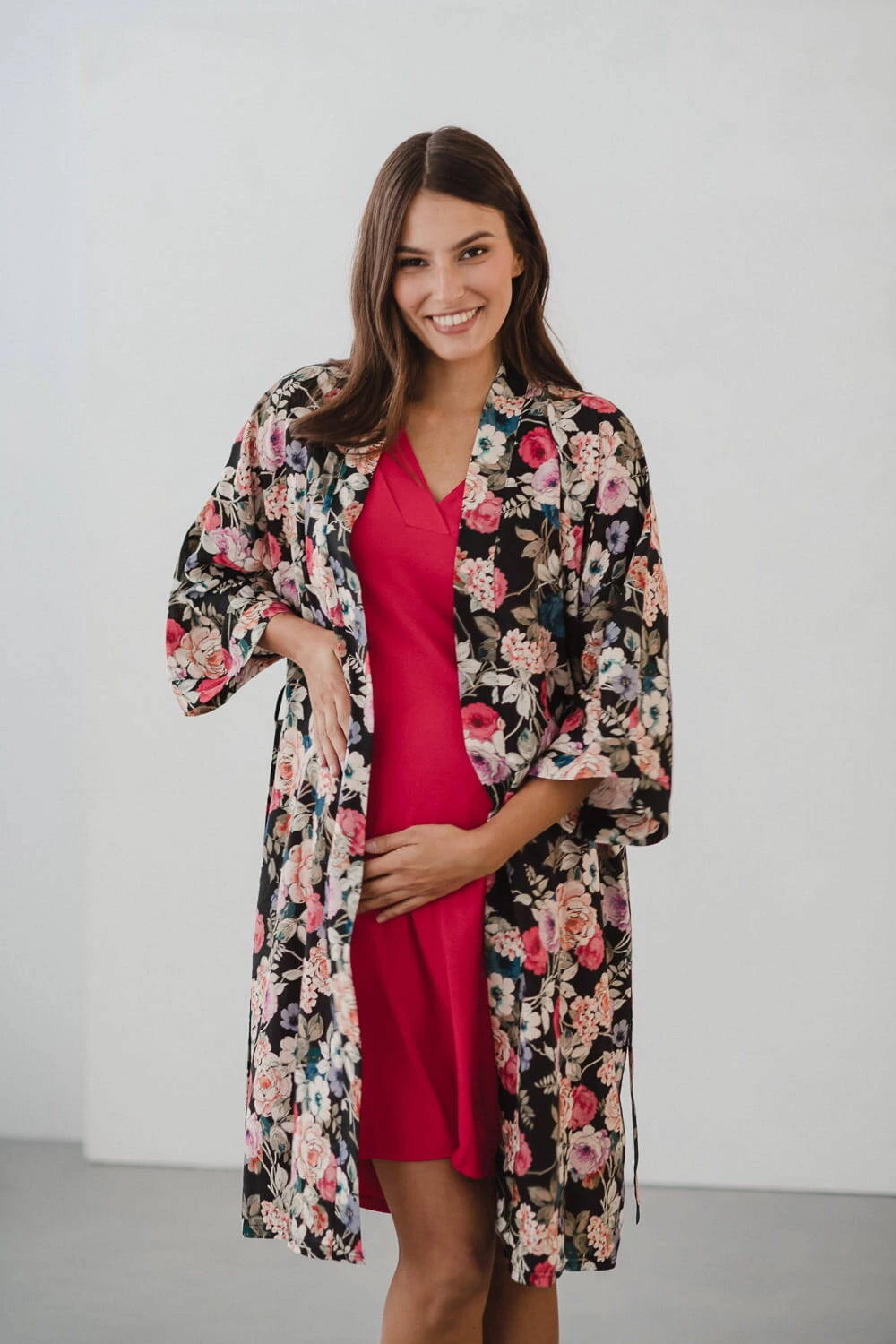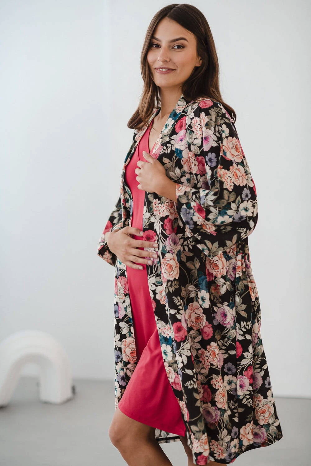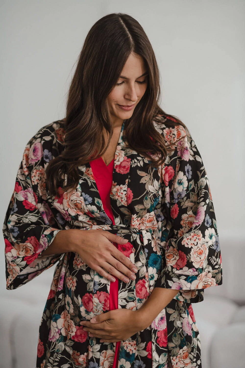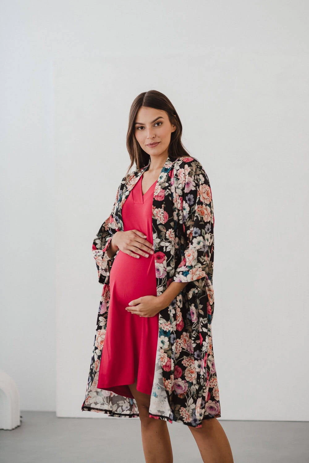 Objevte kouzelný svět pohodlí a elegance - prohlédněte si náš těhotenský župan z limitované edice vyrobený z elegantní květinové látky s příměsí lnu . Pohodlný župan je kus oblečení, který nesmí chybět ve výbavě budoucí maminky. Těhotenský župan pro nemocnici Garden může být vaší oázou klidu a pohodlí - viskóza s příměsí lnu obepne vaše tělo v těhotenství i po porodu a poskytne jedinečnou jemnost a pocit lehkosti. Dostatečně dlouhá se bude skvěle hodit v poporodním období a krátké 7/8 rukávy vám umožní při péči o novorozeně volně vykonávat každodenní činnosti bez omezení v pohybu.