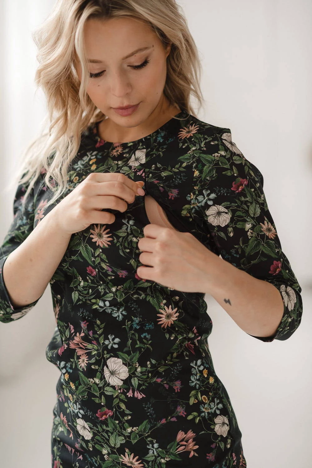 Šaty pro kojící maminky s módním květinovým potiskem mají pohodlné skryté zipy, které umožňují diskrétní kojení, když to miminko potřebuje. Posuvníky jsou posunuty ze spodní strany, což umožňuje upravit velikost krmného otvoru. Střih kojících šatů tužkového typu krásně zvýrazní Vaši postavu. Kojící šaty od značky Milk & Love s květinami na černém podkladu budou pěknou variantou na každý den i na elegantní událost. Kojící šaty byly vyrobeny v Polsku z nejkvalitnějších, prodyšných látek, které prošly přísnými testy Oeko-Tex Standard 100 . Měkký a na dotek příjemný materiál neomezuje pohyby, když potřebujete přiložit miminko k prsu jednou rukou. Dokonalé šaty usnadní kojení mamince i miminku. Díky speciálně vybraným bavlněným vláknům si materiál zachovává svůj tvar a krásný květinový vzor i po mnoha praních, aniž by bylo nutné dodatečné žehlení.