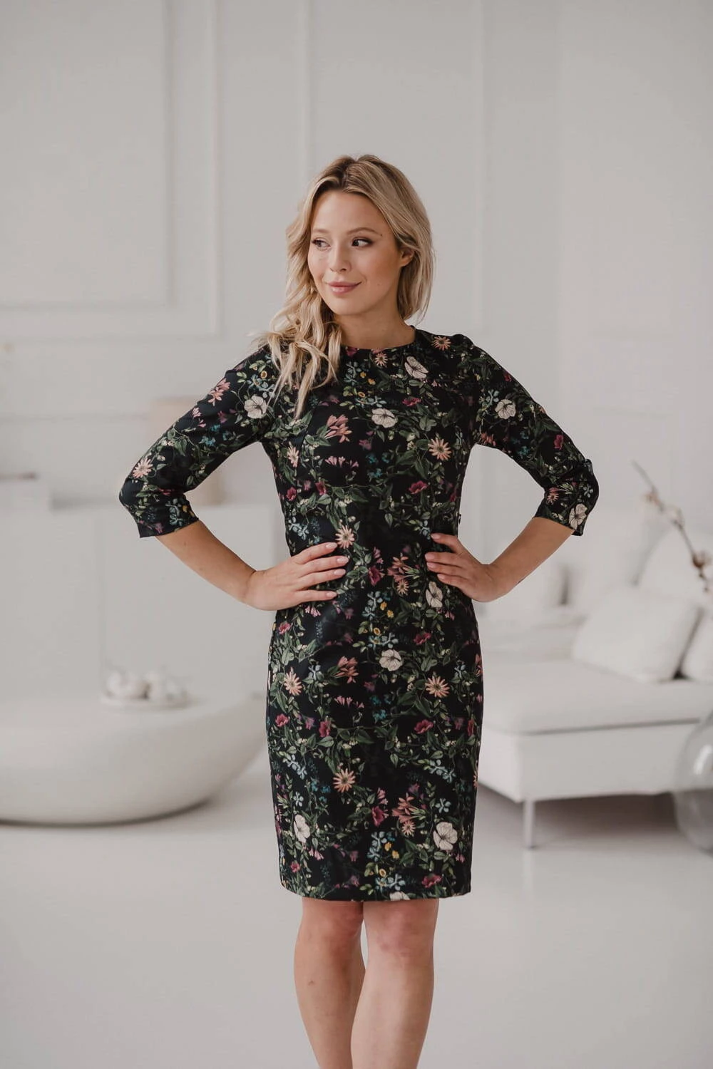 Milky Classic kojící šaty, 3/4 rukáv, černé, s květinami