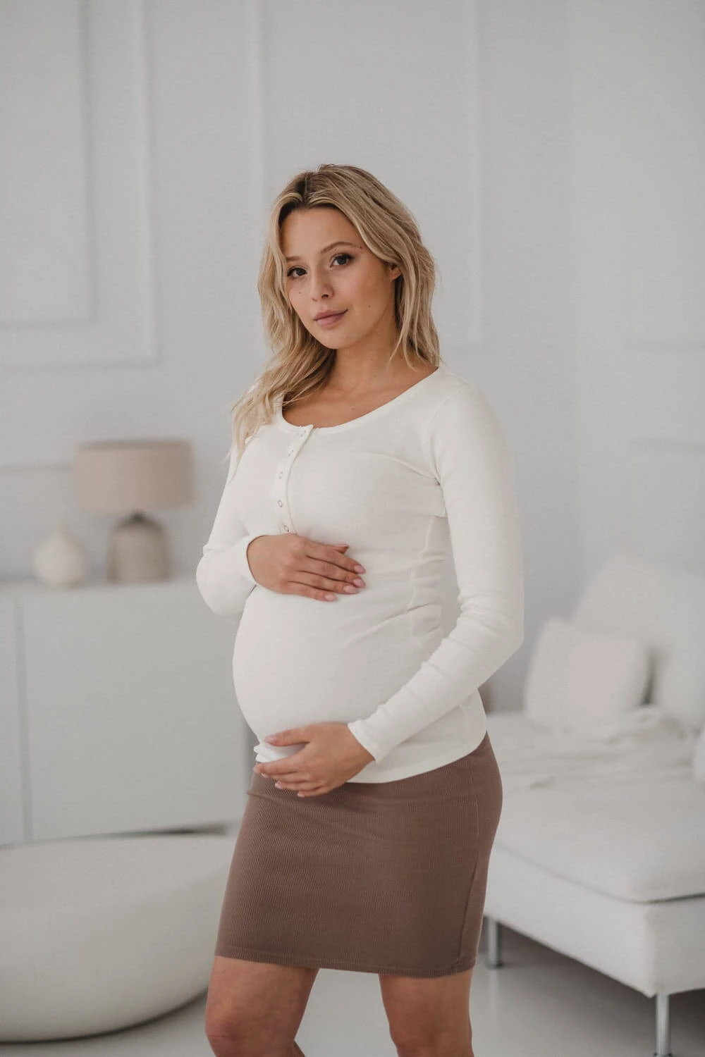 Těhotenská a kojící halenka z žebrovaného ecru materiálu je extrémně pohodlná. Díky kvalitnímu materiálu, který se nedeformuje a zajišťuje pohodlí při nošení, vám dámská těhotenská halenka zůstane na dlouhou dobu. Dokonalá základní těhotenská halenka má vypasovaný střih a zlaté druky ve výstřihu, což usnadňuje volné krmení vašeho miminka. Pohodlné těhotenské halenky jsou perfektní od prvního trimestru, můžete je nosit i po těhotenství jako běžné halenky.  Styly těhotenských halenek Tummy jsou perfektní jak pro každodenní nošení, tak pro zvláštní příležitosti . Stylové těhotenské halenky jsou vyrobeny z bavlněného úpletu a prošly přísnými testy bezpečnosti pro těhotné ženy a děti. Pružný materiál si zachovává hladkost a barvu i po mnoha vyprání, naše těhotenské halenky pro kojící maminky jsou perfektním řešením na dlouhou dobu, a proto nesmí chybět ve vašem těhotenském šatníku.
