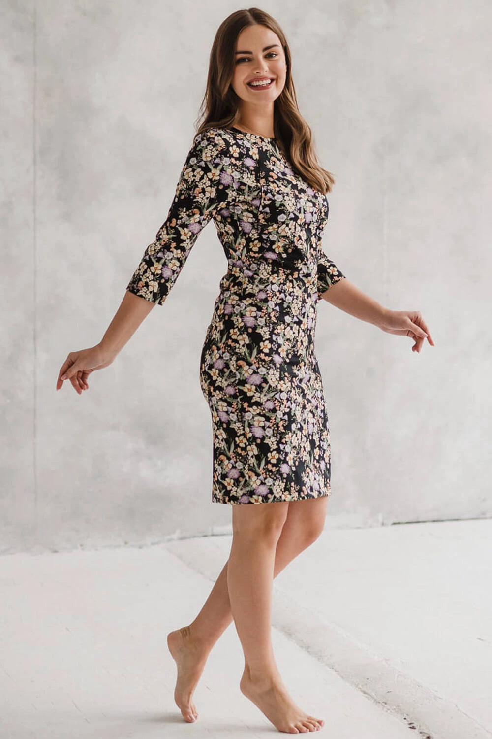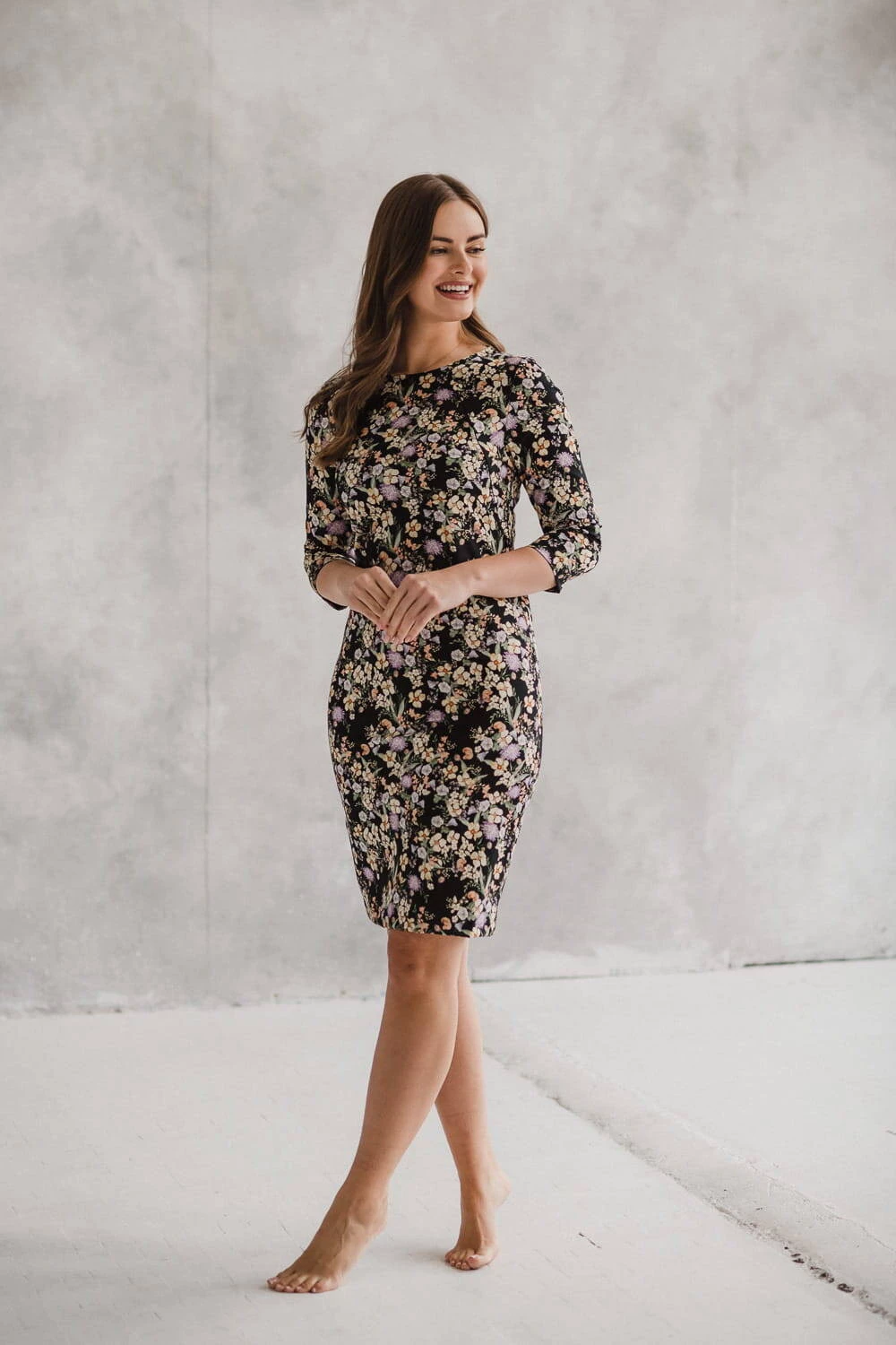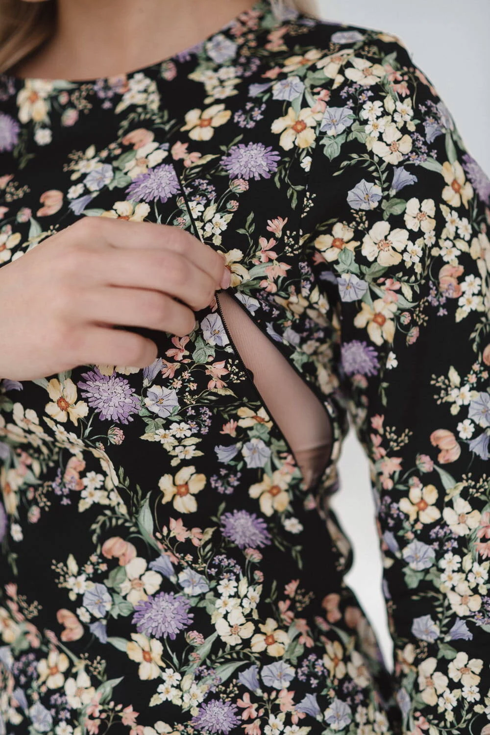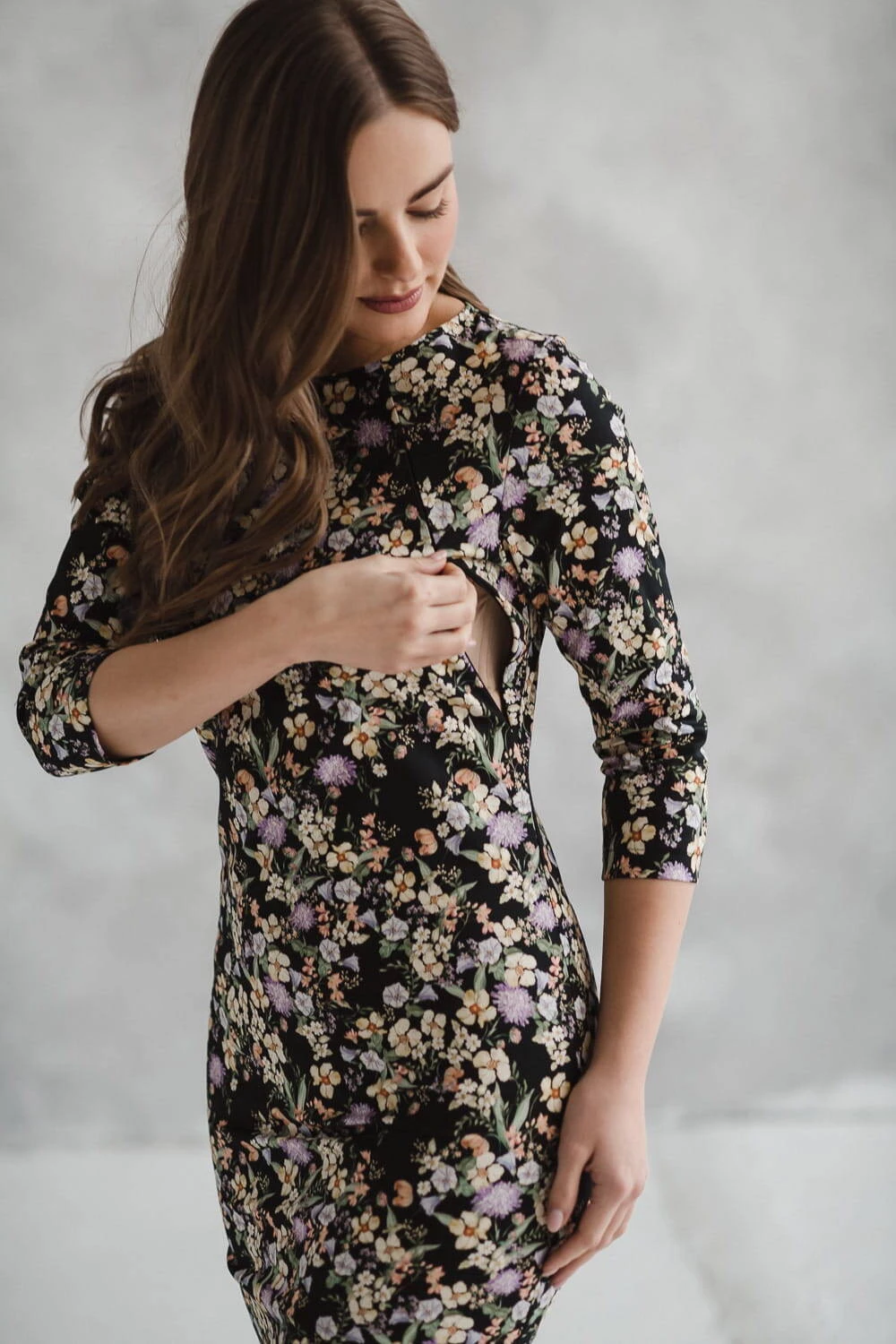 Milky Classic kojící šaty, 3/4 rukáv, černé, s květinami