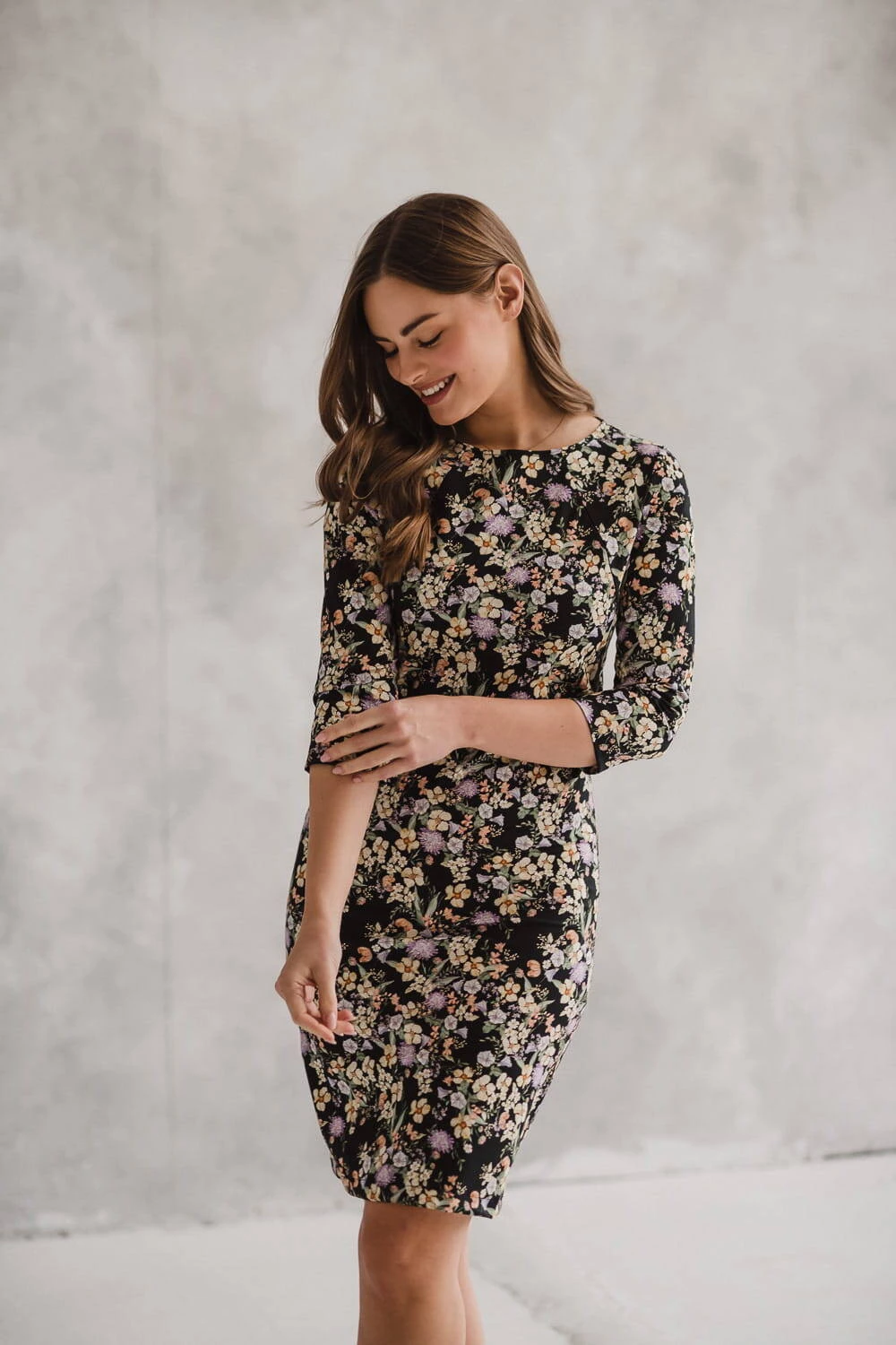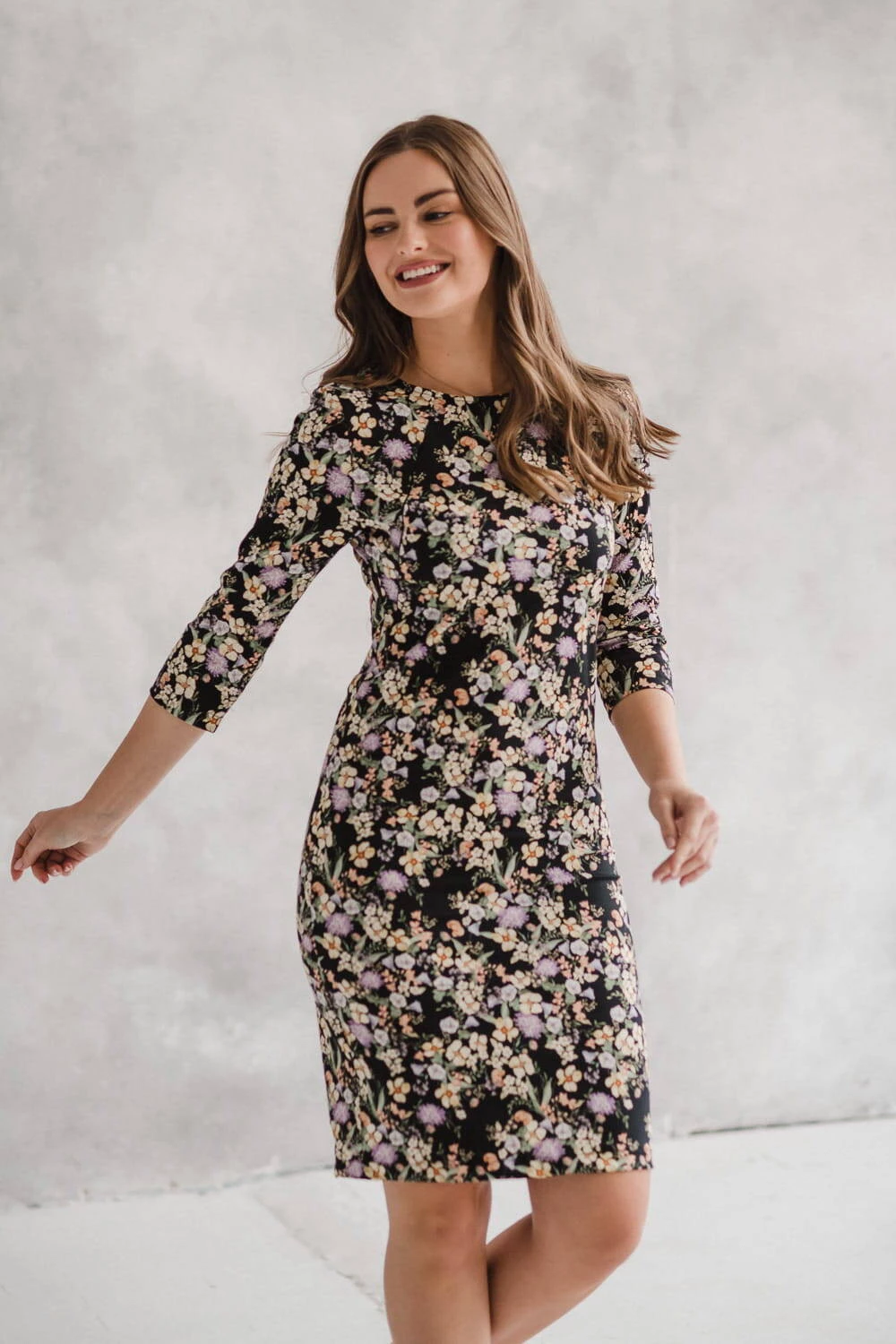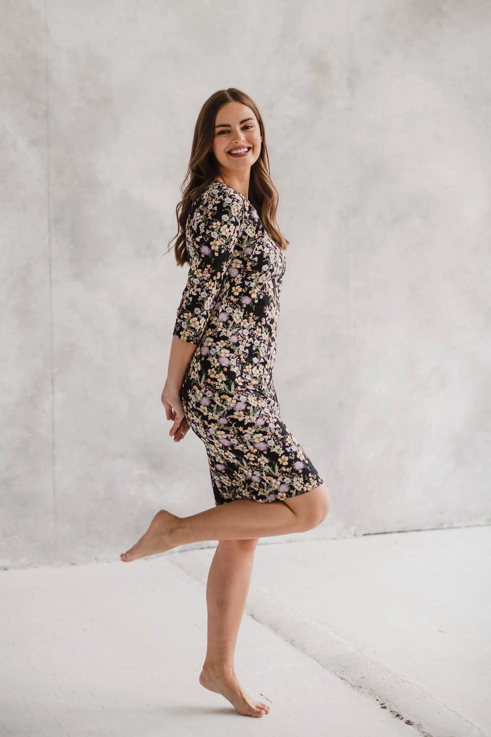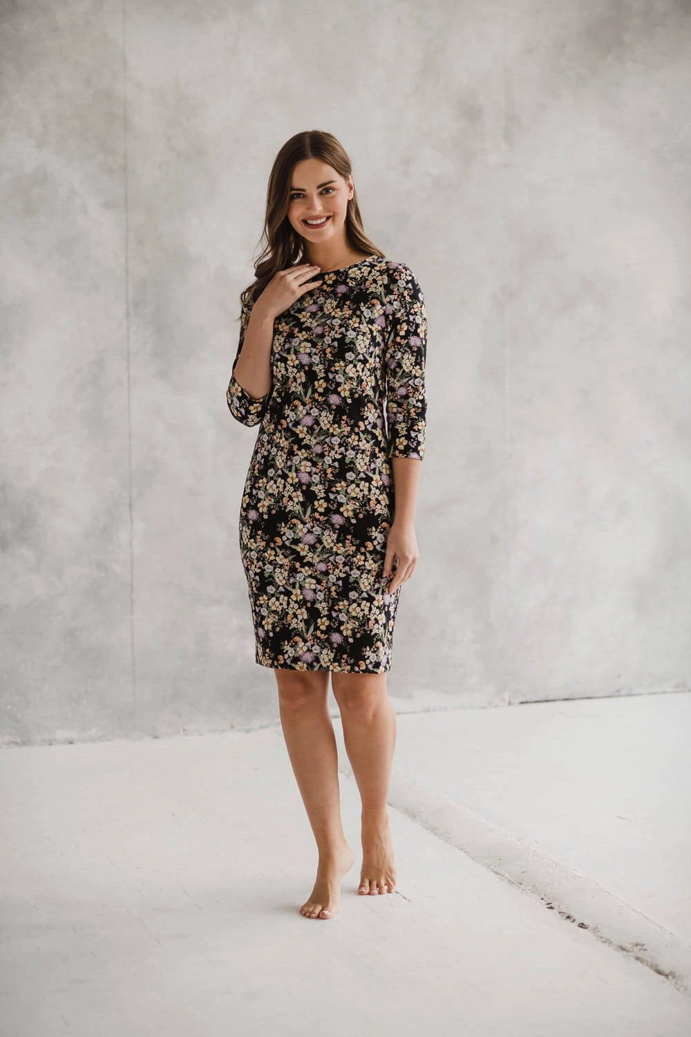 Milky Classic kojící šaty, 3/4 rukáv, černé, s květinami