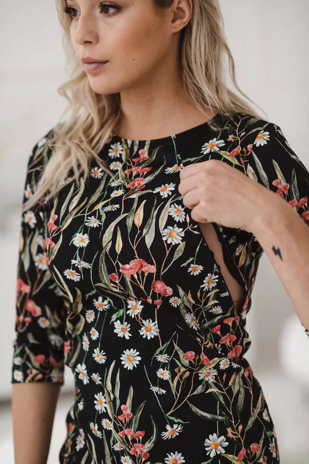 Kojící šaty od značky Milk & Love klasického tužkového střihu, s drobnými kvítky heřmánku na černém pozadí. Jedinečné dámské kojící šaty jsou elegantní outfit vytvořený speciálně pro maminky, které chtějí být stylové po těhotenství při kojení. Kojící šaty jsou ušity z kvalitní bavlněné látky se saténovou úpravou a 5% elastanu a mají extrémně odolné, kryté zipy, které umožňují diskrétně nakrmit miminko za každé situace. Dokonalé šaty, které se díky jednoduchému střihu přizpůsobí vašemu stylu i po těhotenství, kdy přestanete kojit. Tužkový střih heřmánkových šatů krásně zvýrazní ženské tvary a materiál, který prošel přísnými testy Oeko-Tex Standard 100 , si zachovává tvar a barvu i po mnoha vypráních. Naše šaty Milky Classic byly vyrobeny v Polsku a mohou být perfektní volbou pro zvláštní příležitosti, jako je křest nebo svatba. 3/4 délka rukávu zajišťuje pohodlí a pěkně odhaluje ruce.