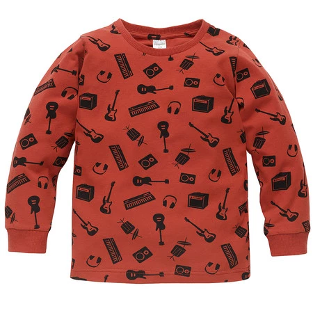 Bluzka z długim rękawem, w kolekcji Lets Rock uszyta została z miękkiej bawełny z dodatkiem elastanu, w ceglastym odcieniu czerwieni. Dodatkowo ozdobiona jest rockowym nadrukiem instrumentów muzycznych. Nadruk wykonany został bezpieczną metodą farb wodnych, odpornych na codzienne użytkowanie i pranie. Przy szyi zastosowano specjalnie dobraną, ozdobną lamówkę. Dla wygody ubierania, w rozmiarach 74-86 zapinana jest na wygodne, bezniklowe napki. Przy rozmiarach 92-122 zakładana jest przez głowę. Bluzka z długim rękawem z kolekcji Lets Rock to absolutny niezbędnik w każdej garderobie niemowlaka i przedszkolaka. Podobnie jak wszystkie ubranka Pinokio, bluzeczka wyprodukowana jest w Polsce. W kolekcji występuje również bluzka w kolorze miętowym.