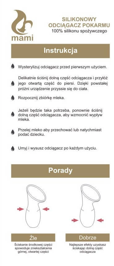 Sběrač mléka MAMI má objem 100 ml, což umožňuje pohodlný sběr potravin. Nezpůsobuje nepohodlí při používání. Je průhledný, což usnadňuje průběžnou kontrolu množství nasbíraných potravin. Matka si tak může být jistá, že se jí nashromážděné mléko nevylije.