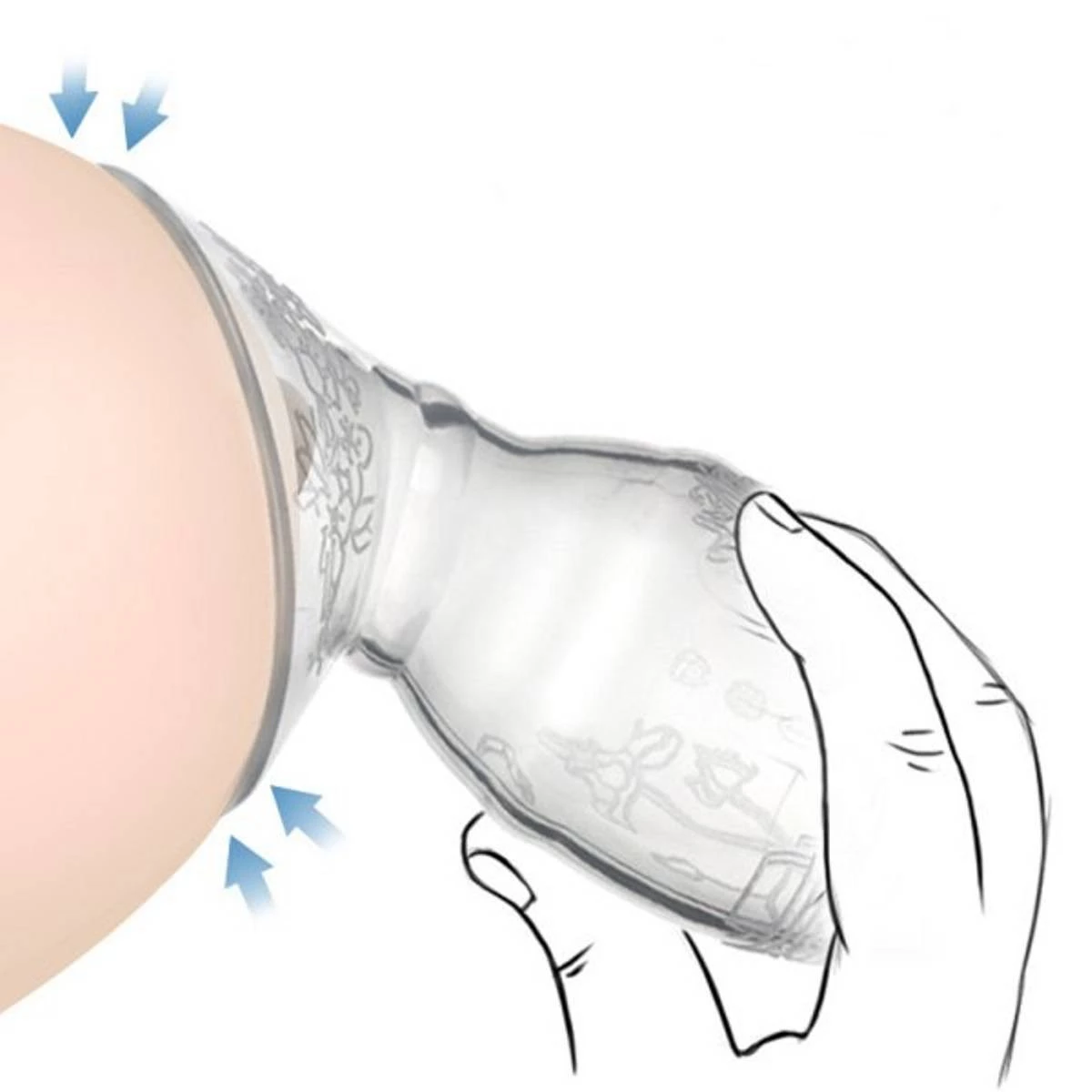 - Jemně stiskněte spodní část a přiložte otevřenou část odsávačky k prsu. Díky vytvořenému vakuu zařízení je na nic tělo.