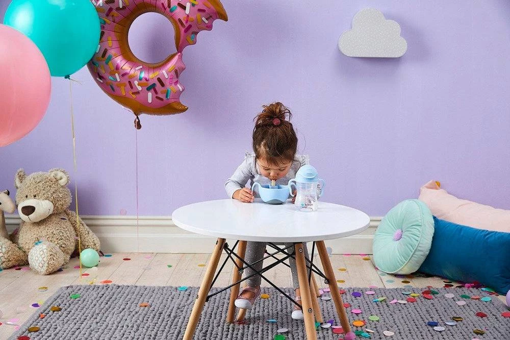 Praktický annovativní řešení usnadnit dítěti samostatné stravování, včetně pokrmů tekuté nebo polotekuté konzistence. Praktická miska s držadly má patentovanou brčko a vložka, která z něj dělá nepitný hrnek. Obsah lze navíc zajistit víkem, které je součástí sady.