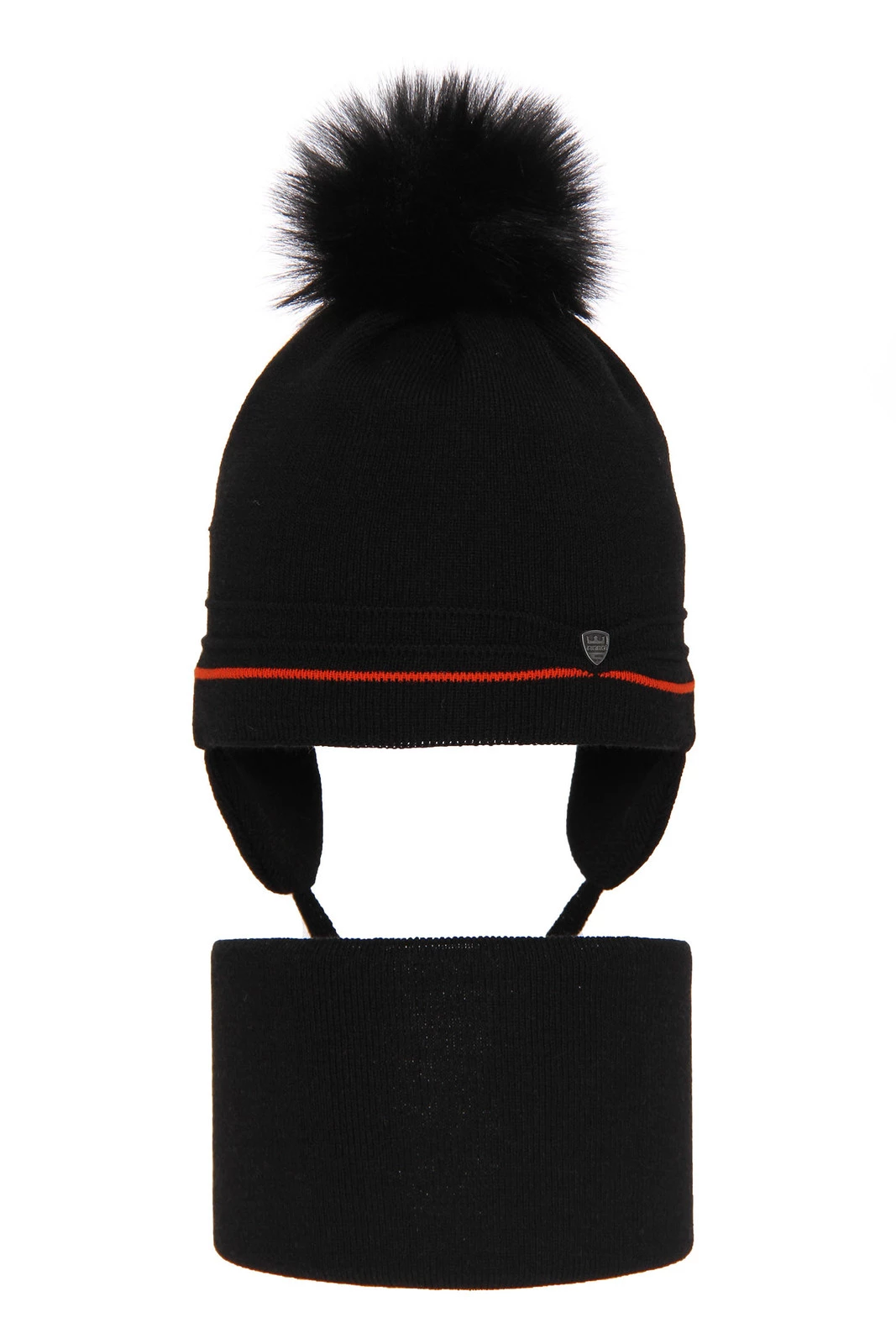 Komplet zimní chlapecký: čepice a tunel černý s bambulí Burgund