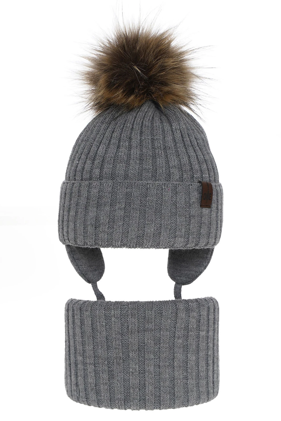 Komplet zimní chlapecký: čepice a tunel šedý s bambulí Puzel