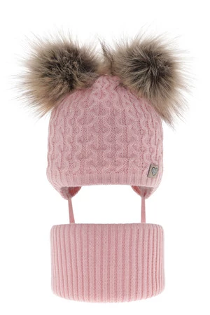 Komplet zimné dievčenské: čiapka a tunel růžový s dvoma bambuľami Poliana