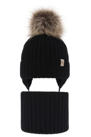 Komplet zimnej dívčí: čepice a tunel černý 100% extra fine merino vlna Junika