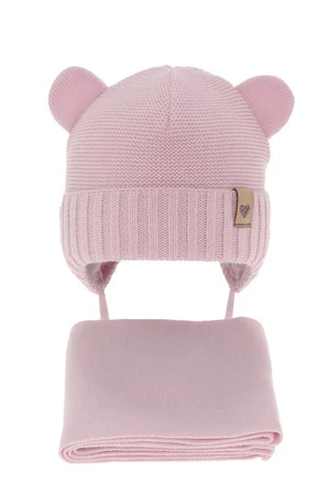 Šálek z kompletu dokonale obepne krk dítěte a ochrání ho před chladným vzduchem. Čepice vybavená praktickými šňůrkami umožňuje stabilní upevnění, což je obzvláště důležité během aktivních her venku. Ozdobná ouška dodávají celému kompletu dívčí půvab, který určitě potěší každou malou princeznu.