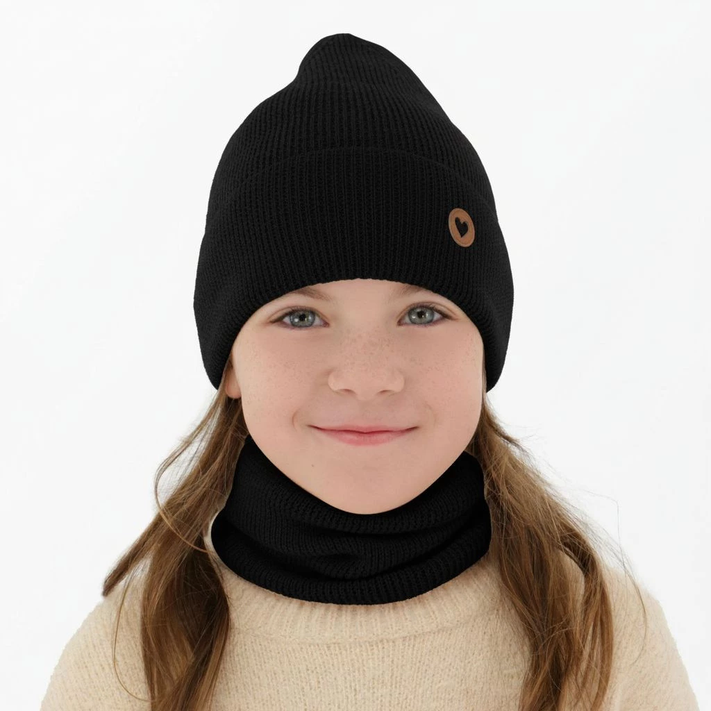 Komplet jesenný/jarný dievčenský čiapka a tunel černý 100% extrafine merino vlna Brook