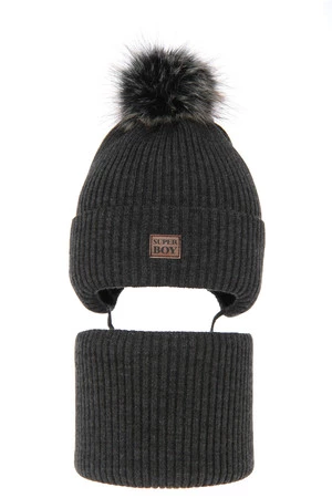 Komplet zimní chlapecký: čepice a tunel šedý s bambulí Denzel