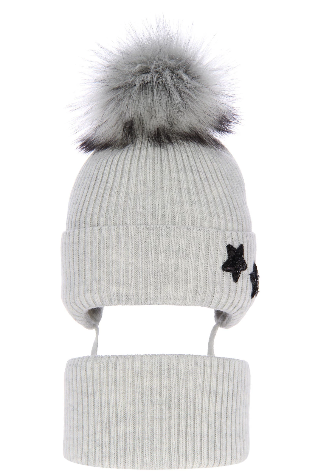 Komplet zimní dívčí: čepice a tunel šedý s bambulí Delicja