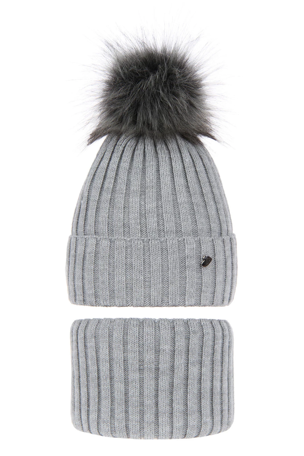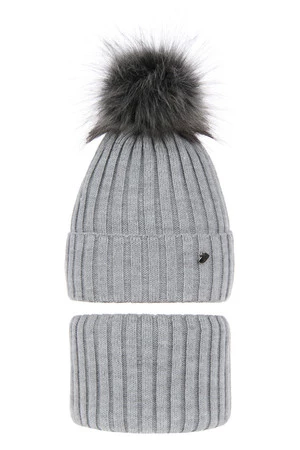 Komplet zimní dívčí: čepice a tunel šedý s bambulí Wilma