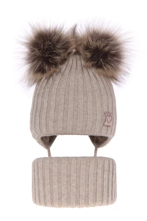 Komplet zimní dívčí: čepice a tunel béžový se dvěma bambulemi Telisa