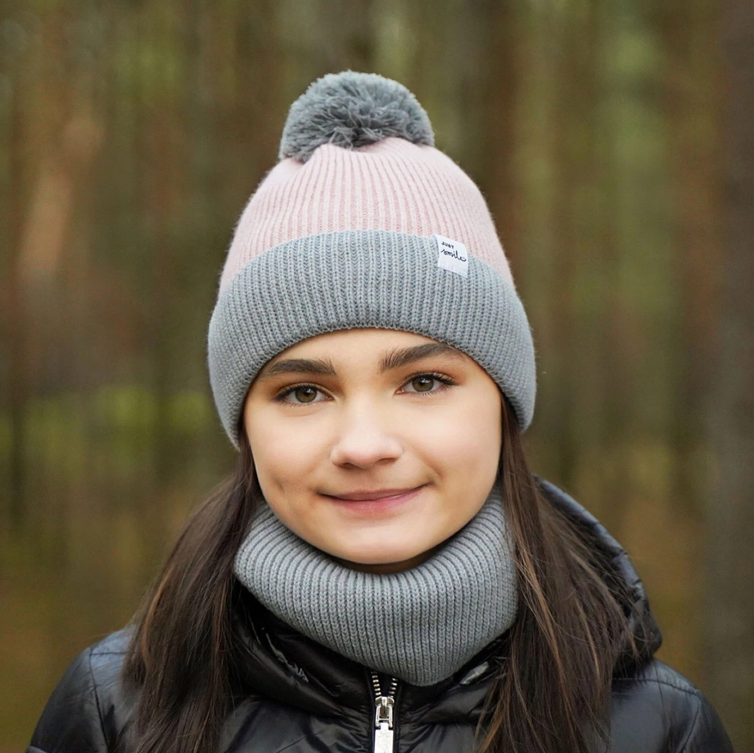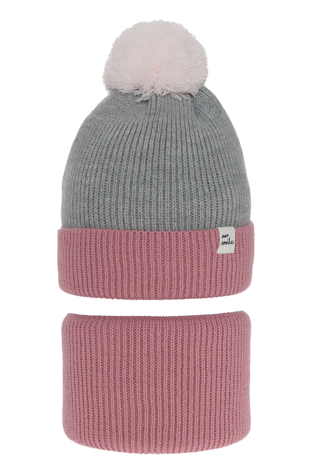 Zimní komplet Rosalin je spojením stylu a funkčnosti. Módní pruhovaný vzor dodává celku jedinečný charakter a roztomilá nášivka s nápisem "just smile" tvoří půvabné zakončení, které určitě potěší každou dívku. Velký, měkký bambulový pompon doplňuje celek a dodává čepici dívčí šarm.