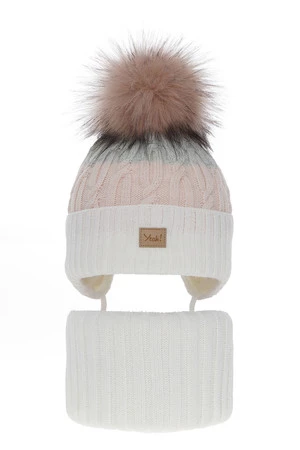 Komplet zimní dívčí: čepice a tunel krémový s bambulí Riviera