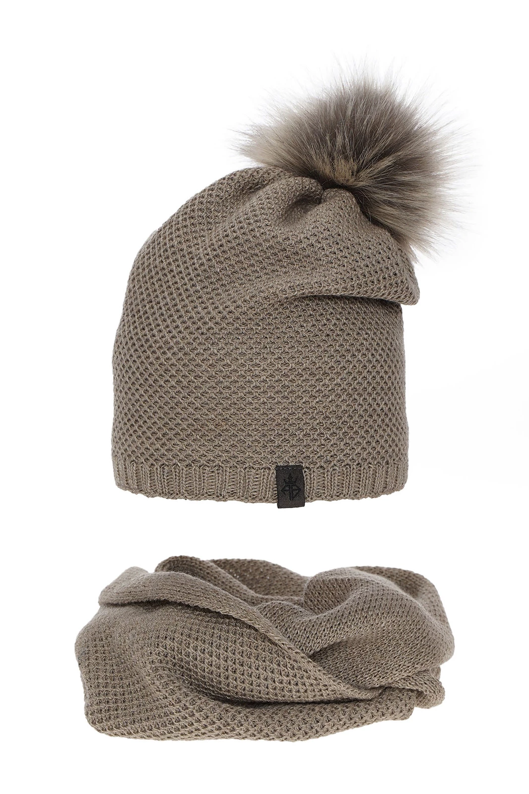 Elegantní žebrovaný steh dodává kompletu Kaliana nadčasový charakter, který se dokonale hodí k jakémukoliv zimnímu šatníku. Čepici korunuje efektní, nadýchaná bambule vyrobená z ekologické kožešiny, která tvoří módní akcent celku. Malá, diskrétní nášivka přidává jemnou eleganci, aniž by narušila harmonický design.
