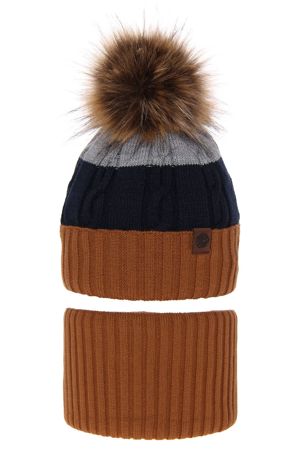 Komplet zimní chlapecký: čepice a tunel hnědý s bambulí Karmel