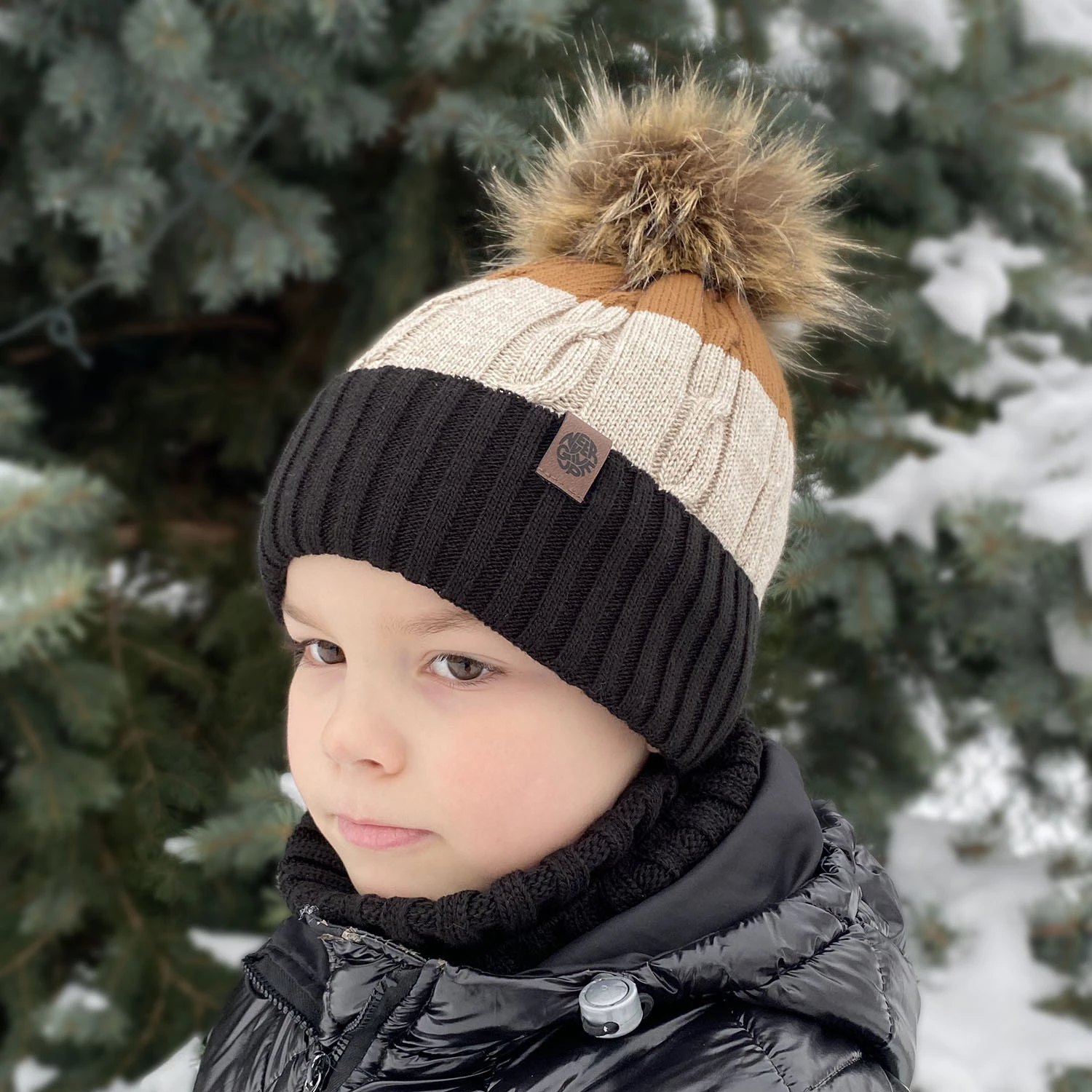 Zimní chlapecký komplet Karmel se vyznačuje pečlivě zpracovaným, zajímavým pleteným vzorem, který mu dodává výjimečný charakter. Ozdobený velkým, nadýchaným bambulí z ekologické kožešinky a jemnou nášivkou představuje nejen praktický, ale i módní prvek šatníku vašeho dítěte.