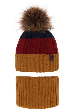 Zimní chlapecký komplet Karmel se vyznačuje pečlivě zpracovaným, zajímavým pleteným vzorem, který mu dodává výjimečný charakter. Ozdobený velkým, nadýchaným bambulí z ekologické kožešinky a jemnou nášivkou představuje nejen praktický, ale i módní prvek šatníku vašeho dítěte.