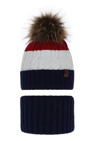 Komplet zimní chlapecký: čepice a tunel tmavě modrý s bambulí Karmel