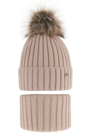 Komplet zimní dívčí: čepice a tunel béžový s bambulí Wilma