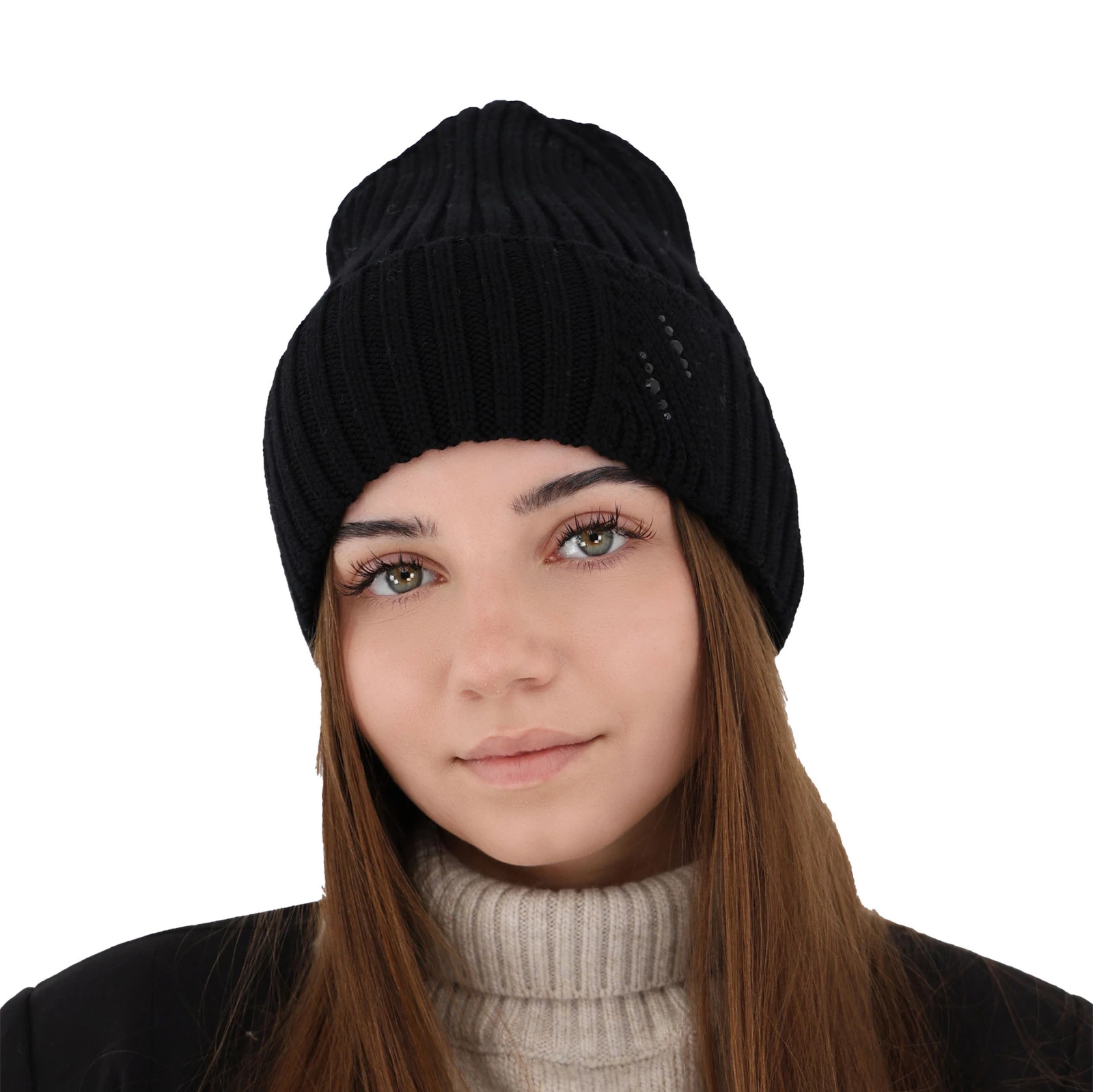 Elegantní dámská čepice je navíc zdobena subtilními kamínky, které jí dodávají eleganci a ženský charakter. Je to drobný, ale významný detail, který způsobuje, že i v každodenním outfitu se můžete cítit výjimečně. Třpytivé prvky jemně odrážejí světlo a dodávají vašemu zimnímu looku vytříbenost.