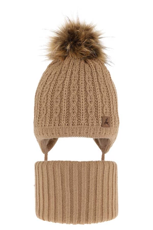 Kompletná zimná detská sada: čiapka a šál camel s bambuľou Pago