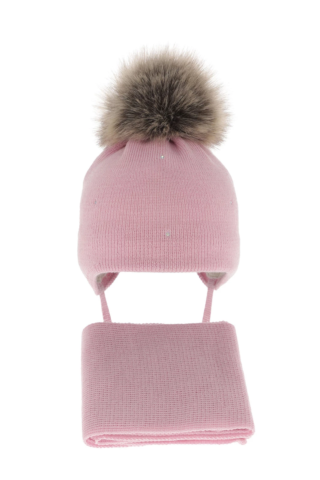 Dívčí charakter kompletu zdůrazňuje roztomilý pompon z jemné eko kožešiny, který dodává celku šarm a výraznost. Jemné kamínky tvoří elegantní akcent, dodávající kompletu výjimečný charakter, který se zalíbí každé malé módní nadšenkyni.