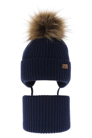 Kompletná zimná detská sada: čiapka a šál tmavě modrý s bambuľou Bergo