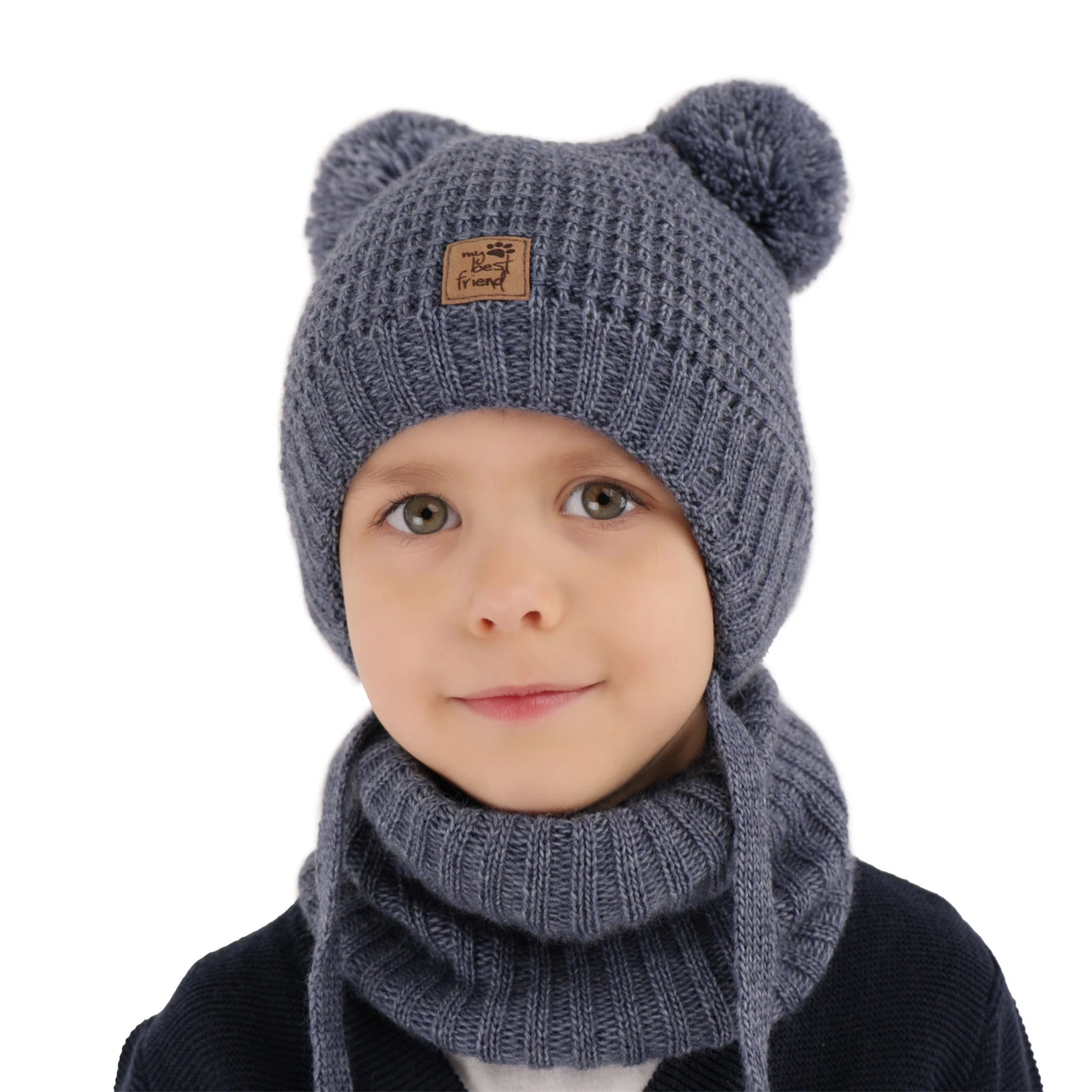 Kompletná zimná detská sada Krispi se vyznačuje žebrovaným vzorem a ozdobnou nášivkou, které jí dodávají charakter a zajišťují, že vaše dítě bude vypadat módně a stylově. Dvě bambule jsou prvkem, který nejen přitahuje pozornost, ale také dodává čepici výjimečný, hravý charakter.