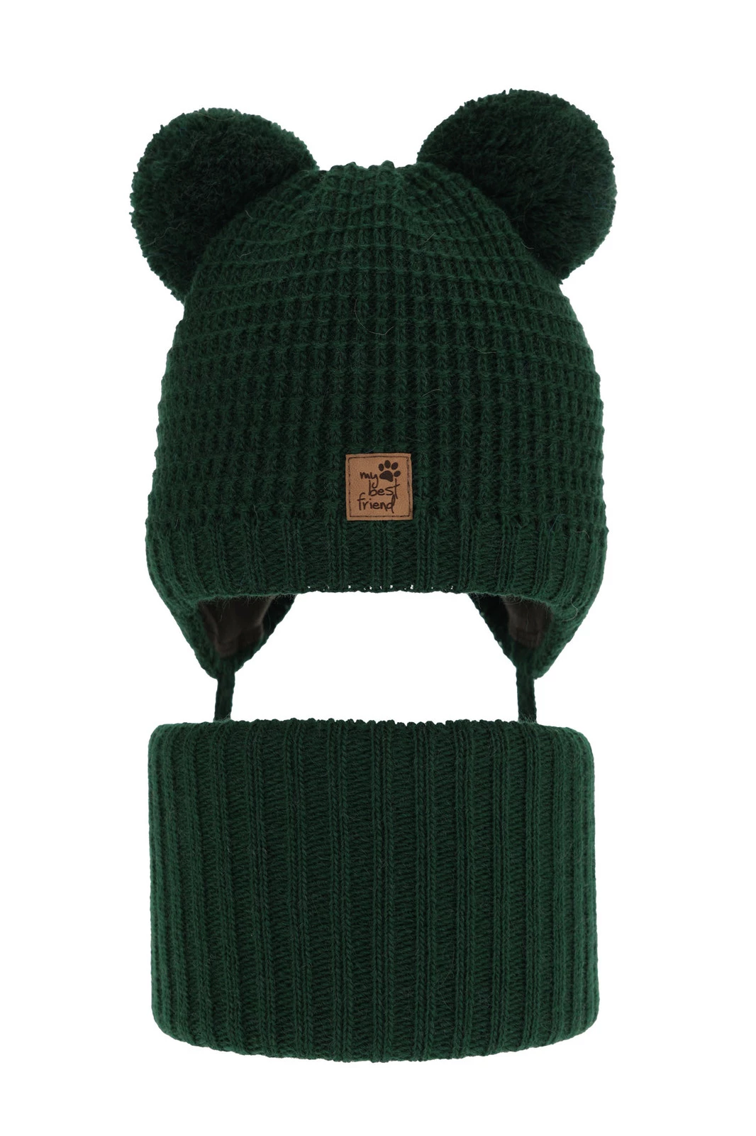 Kompletná zimná detská sada: zelený čiapka a šál s dvoma mašľami Krispi
