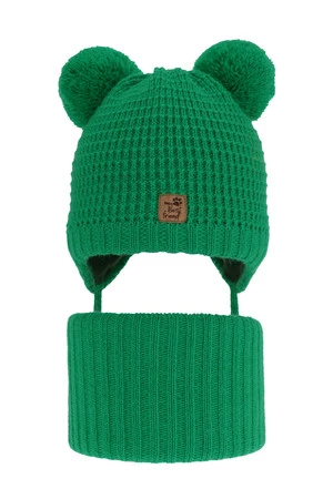 Kompletná zimná detská sada: zelený čiapka a šál s dvoma mašľami Krispi