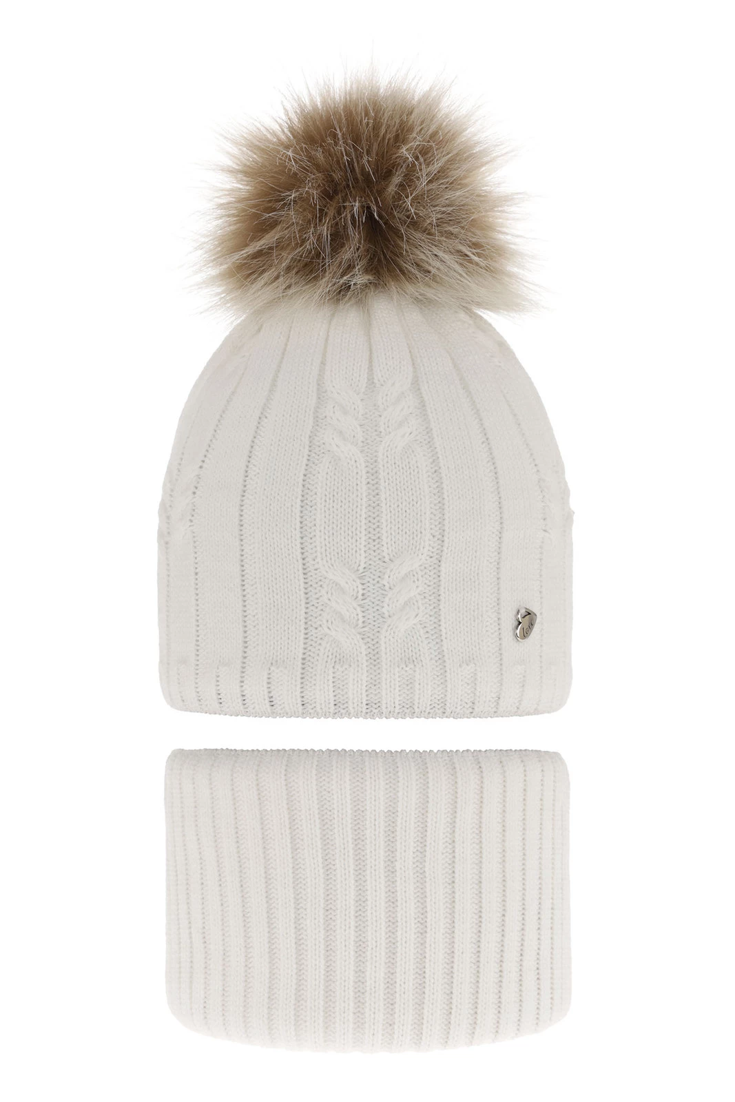Komplet zimní dívčí: čepice a tunel bílý bambulí Amaltea