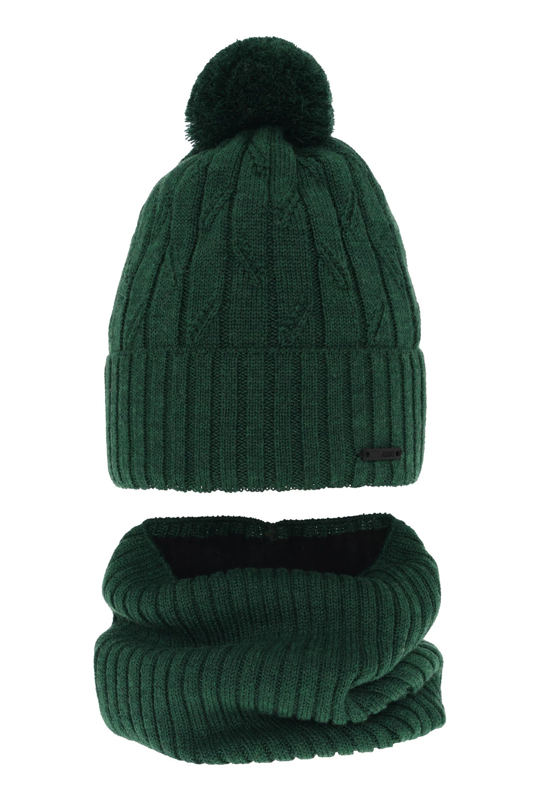Kompletná zimná detská sada: čiapka a šál zelený s bambuľou merino vlna Talar
