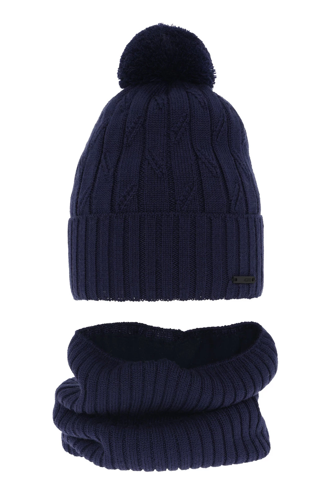 Kompletná zimná detská sada: čiapka a šál tmavě modrý merino vlna s bambuľou Talar