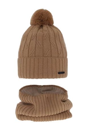Kompletná zimná detská sada: čiapka a šál camel s bambuľou merino vlna Talar