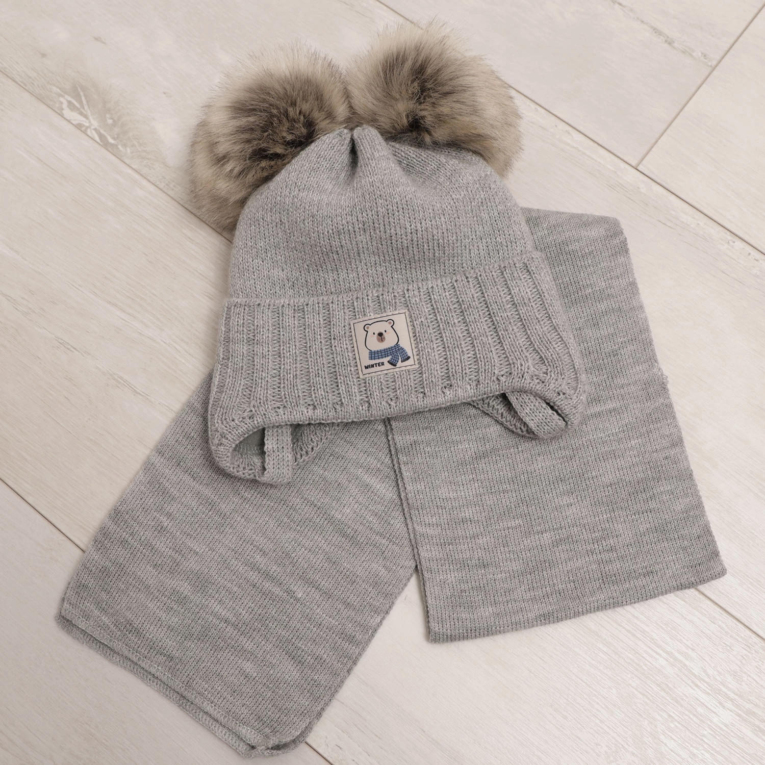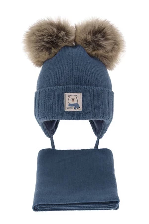 Komplet zimní chlapecký: čepice a šála s dvěma bambulemi Jewel kombinuje módní design s praktičností. Čepice se vyznačuje roztomilou nášivkou s medvídkem, která určitě potěší každého malého dobrodruha. Charakteristické dvě bambule z ekologické kožešiny dodávají celku jedinečný charakter a zajistí, že váš syn bude vypadat výjimečně během zimních dobrodružství.